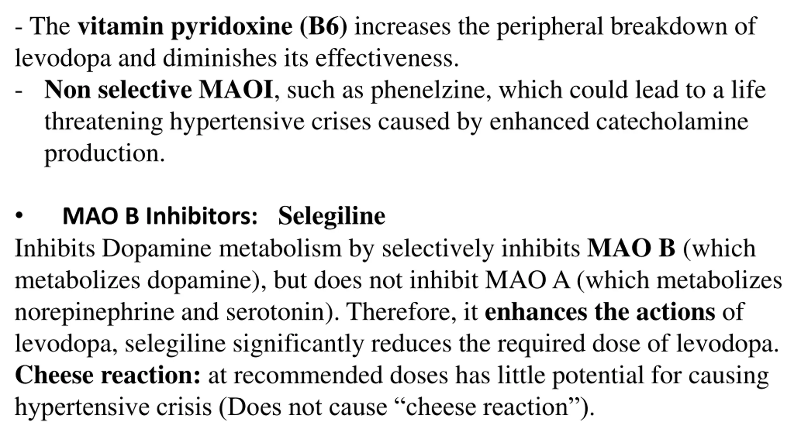 - The vitamin pyridoxine (B6) increases the peripheral breakdown of levodopa and diminishes its effectiveness. - Non selective MAOI, such as phenelzine, which could lead to a life threatening hypertensive crises caused by enhanced catecholamine production. MAO B Inhibitors: Selegiline Inhibits Dopamine metabolism by selectively inhibits MAO B (which metabolizes dopamine), but does not inhibit MAO A (which metabolizes norepinephrine and serotonin). Therefore, it enhances the actions of levodopa, selegiline significantly reduces the required dose of levodopa. Cheese reaction: at recommended doses has little potential for causing hypertensive crisis (Does not cause cheese reaction ).