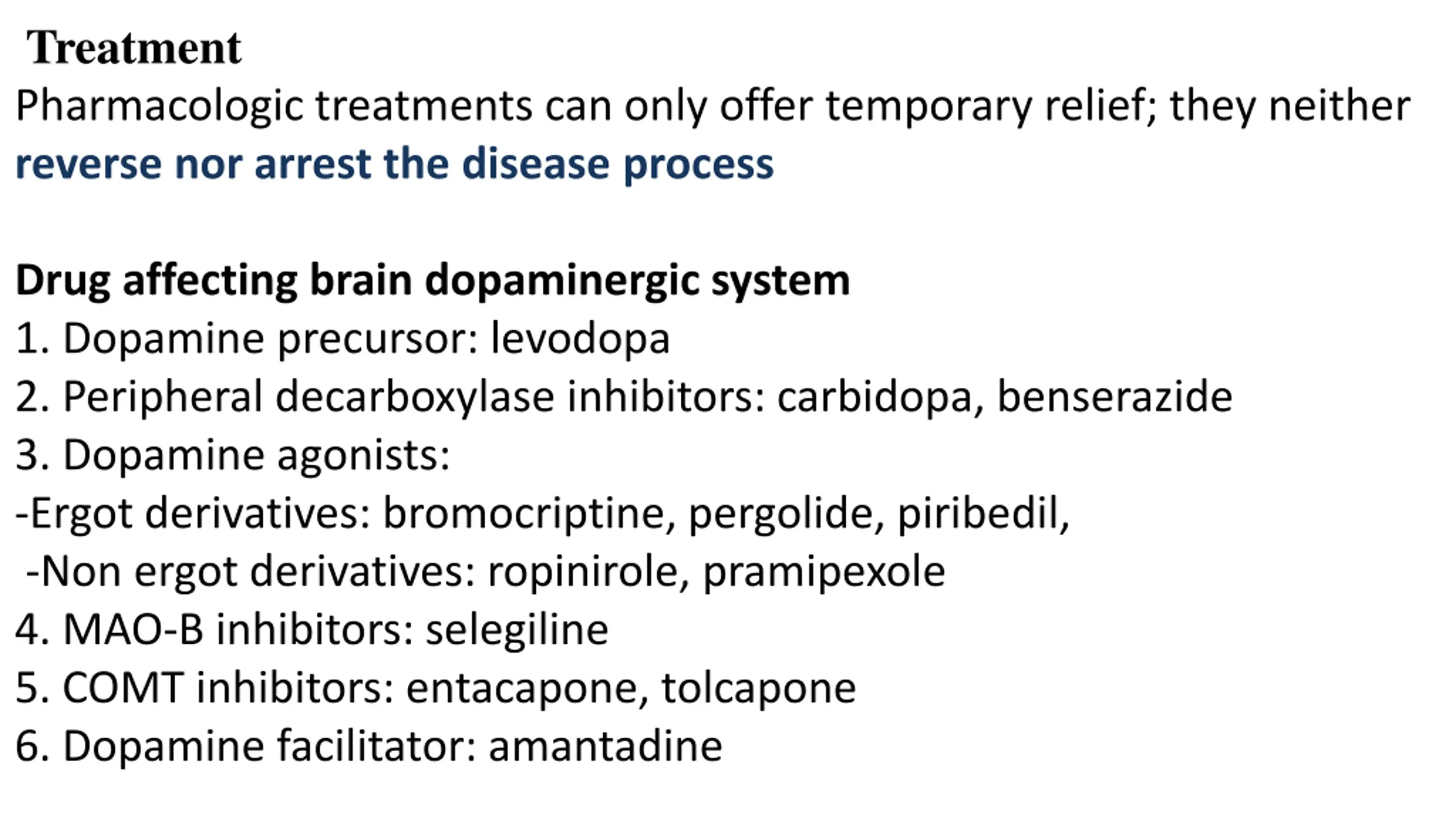 Treatment Pharmacologic treatments can only offer temporary relief; they neither reverse nor arrest the disease process Drug affecting brain dopaminergic system 1. Dopamine precursor: levodopa 2. Peripheral decarboxylase inhibitors: carbidopa, benserazide 3. Dopamine agonists: -Ergot derivatives: bromocriptine, pergolide, piribedil, -Non ergot derivatives: ropinirole, pramipexole 4. MAO-B inhibitors: selegiline 5. COMT inhibitors: entacapone, tolcapone 6. Dopamine facilitator: amantadine