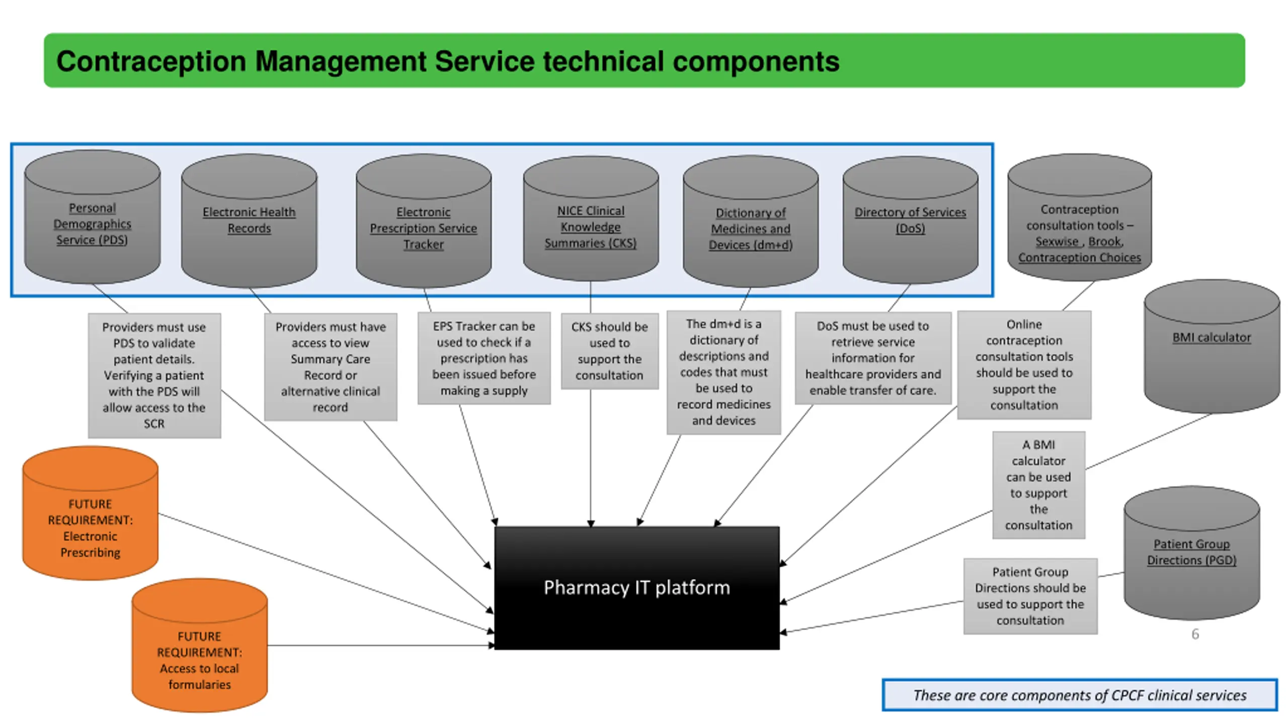 Contraception Management Service technical components Personal Demographics Service (PDS) Contraception consultation tools Sexwise , Brook, Contraception Choices NICE Clinical Knowledge Summaries (CKS) Electronic Health Records Electronic Prescription Service Tracker Directory of Services (DoS) Dictionary of Medicines and Devices (dm+d) The dm+d is a dictionary of descriptions and codes that must be used to record medicines and devices Online DoS must be used to retrieve service information for healthcare providers and enable transfer of care. EPS Tracker can be used to check if a prescription has been issued before making a supply Providers must have access to view Summary Care Record or alternative clinical record CKS should be used to support the consultation Providers must use PDS to validate patient details. Verifying a patient with the PDS will allow access to the SCR BMI calculator contraception consultation tools should be used to support the consultation A BMI calculator can be used to support the consultation FUTURE REQUIREMENT: Electronic Prescribing Patient Group Directions (PGD) Patient Group Directions should be used to support the consultation Pharmacy IT platform 6 FUTURE REQUIREMENT: Access to local formularies These are core components of CPCF clinical services