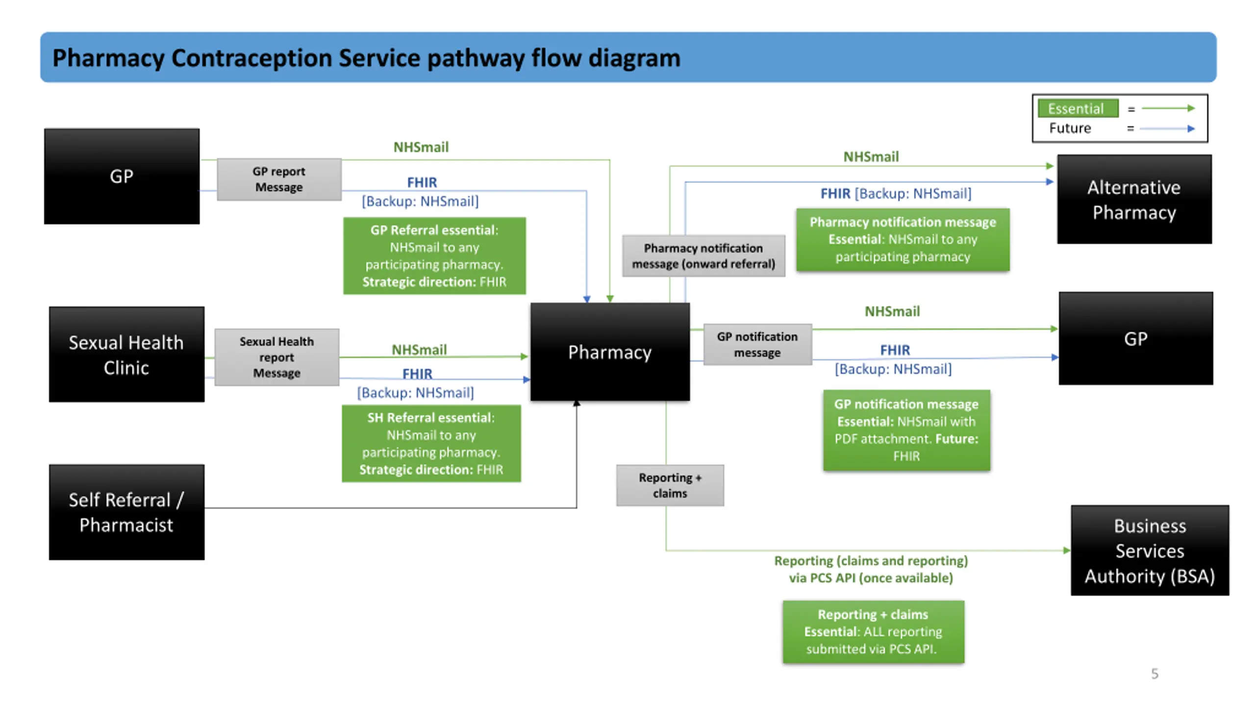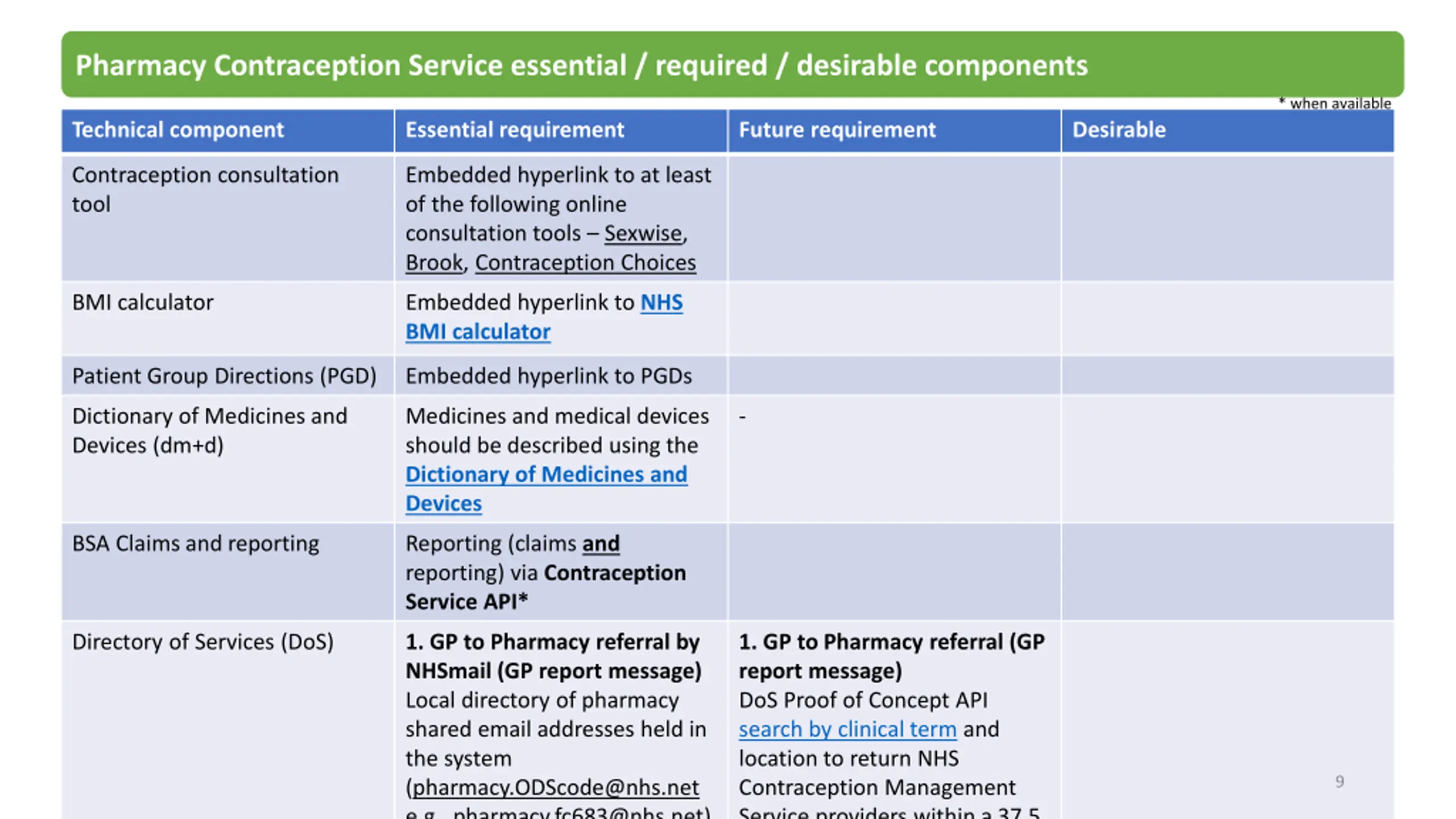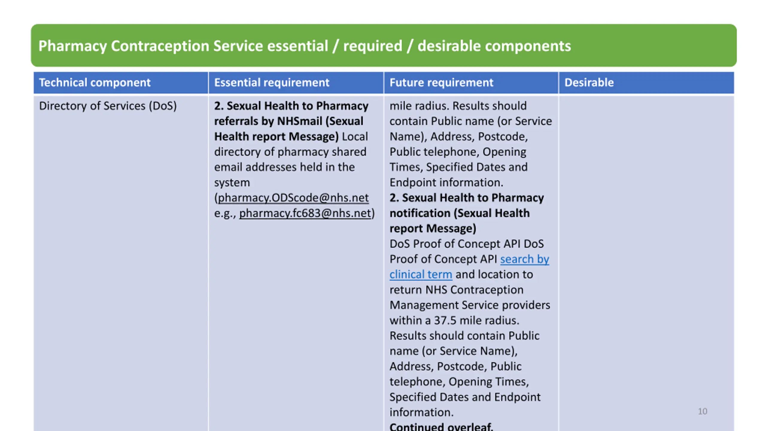 Pharmacy Contraception Service / required / desirable components Technical component Essential requirement Future requirement Desirable Directory of Services (DoS) 4. Pharmacy to Pharmacy referral by NHSmail (Pharmacy notification message) Local directory of pharmacy service information (Results should contain Service Name, Address, Postcode, Public telephone, Opening Times) and shared email address (pharmacy.ODScode@nhs.net e.g., pharmacy.fc683@nhs.net) 4. Pharmacy to Pharmacy referral (Pharmacy notification message) DoS Proof of Concept API search by clinical term and location to return NHS Contraception Management Service providers within a 37.5 mile radius. Results should contain Public name (or Service Name), Address, Postcode, Public telephone, Opening Times, Specified Dates and Endpoint details. Local formularies Access to information on local formularies Prescribing capability Electronic prescribing capabilities 12