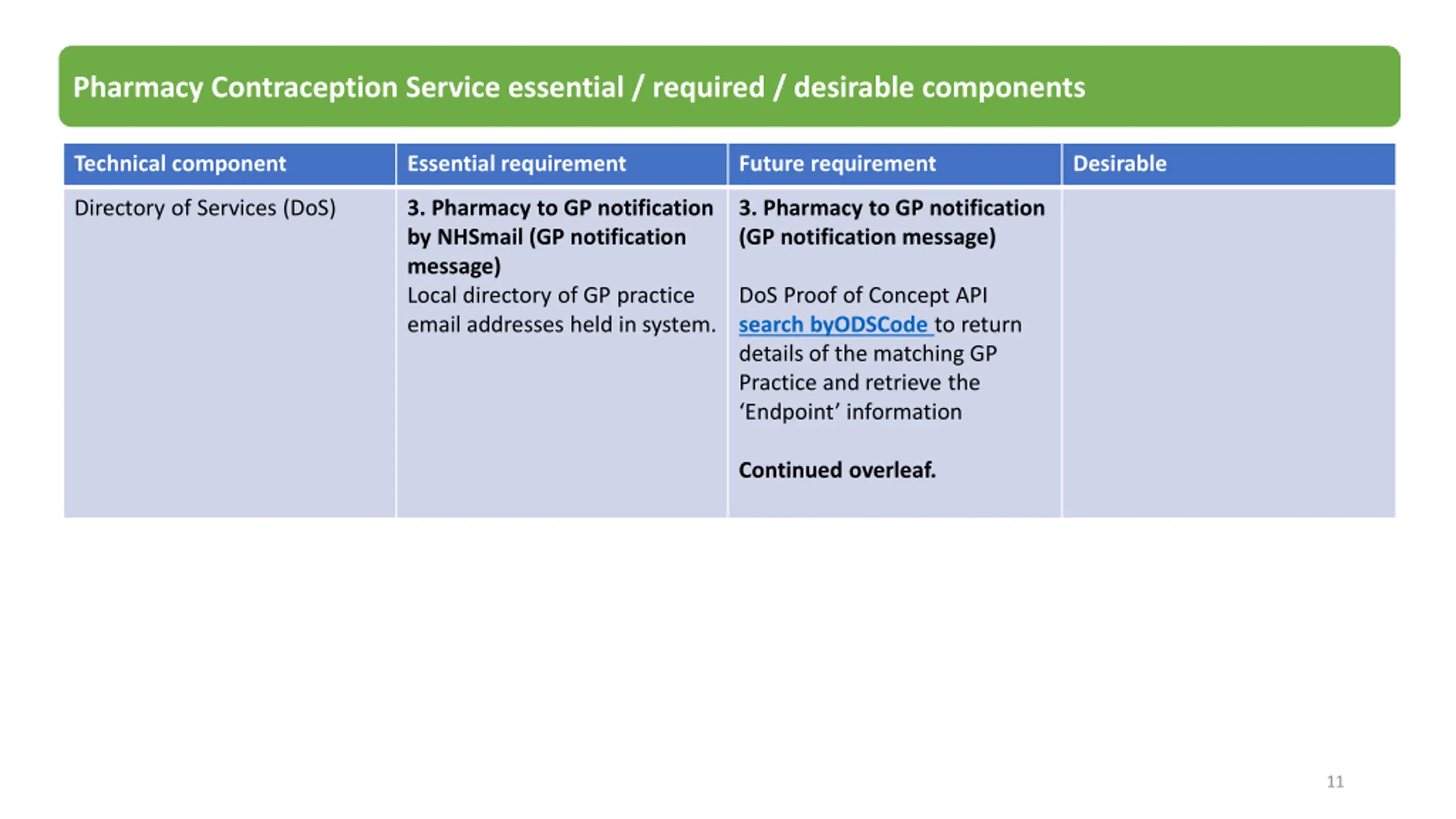 Pharmacy Contraception Service essential / required / desirable components Technical component Essential requirement Future requirement Desirable Directory of Services (DoS) 3. Pharmacy to GP notification by NHSmail (GP notification message) Local directory of GP practice email addresses held in system. 3. Pharmacy to GP notification (GP notification message) DoS Proof of Concept API search byODSCode to return details of the matching GP Practice and retrieve the Endpoint information Continued overleaf. 11
