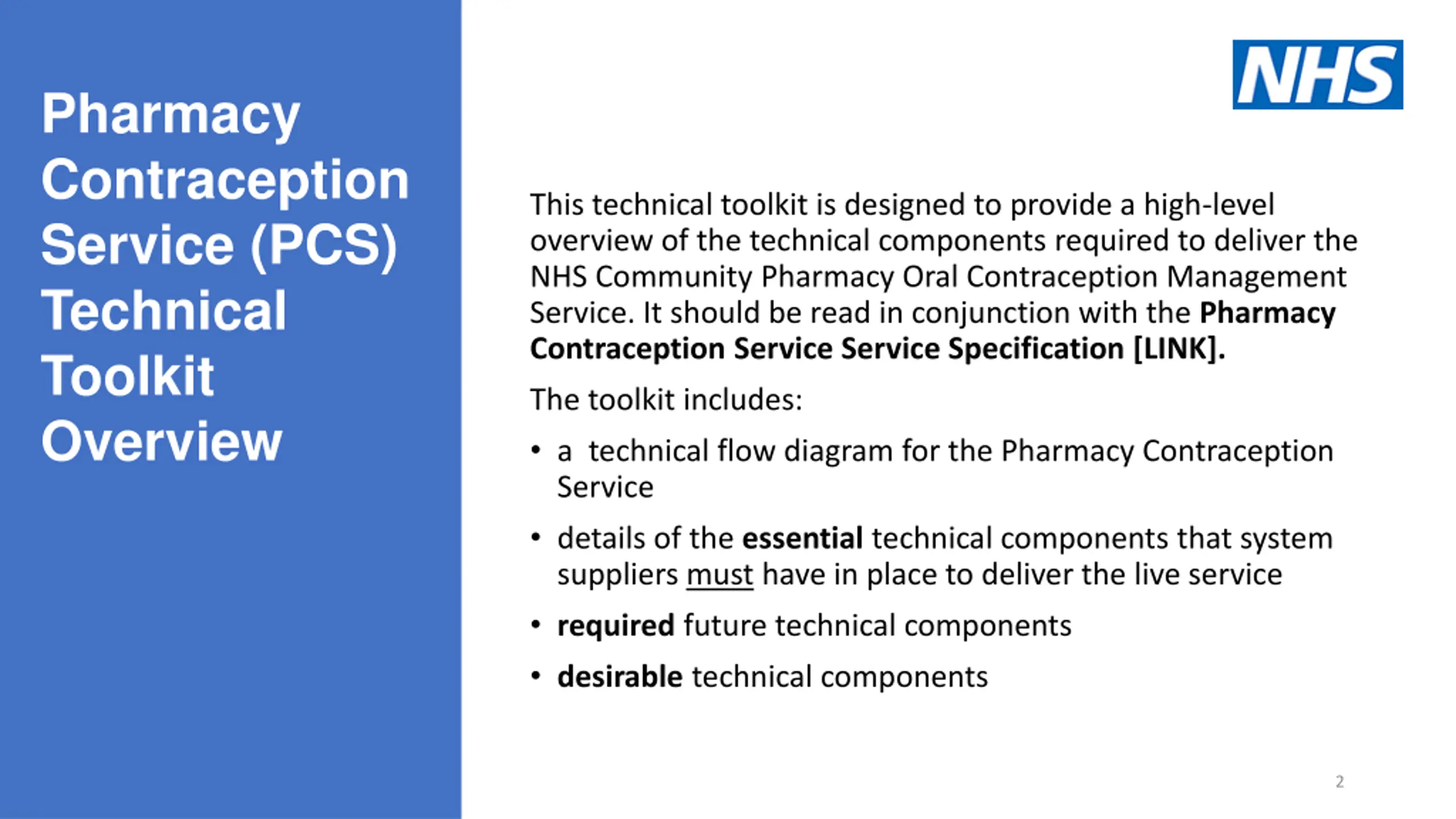 Pharmacy Contraception Service (PCS) Technical Toolkit Overview This technical toolkit is designed to provide a high-level overview of the technical components required to deliver the NHS Community Pharmacy Oral Contraception Management Service. It should be read in conjunction with the Pharmacy Contraception Service Service Specification [LINK]. The toolkit includes: a technical flow diagram for the Pharmacy Contraception Service details of the essential technical components that system suppliers must have in place to deliver the live service required future technical components desirable technical components 2