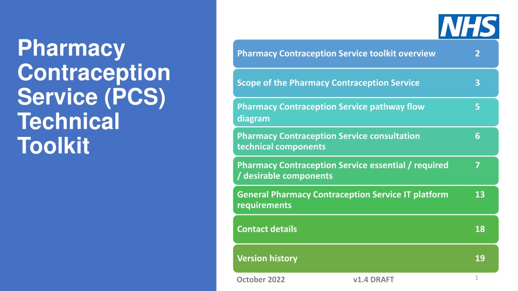 Pharmacy Contraception Service (PCS) Technical Toolkit Pharmacy Contraception Service toolkit overview 2 Scope of the Pharmacy Contraception Service 3 Pharmacy Contraception Service pathway flow diagram 5 Pharmacy Contraception Service consultation technical components 6 Pharmacy Contraception Service essential / required / desirable components 7 General Pharmacy Contraception Service IT platform requirements 13 Contact details 18 Version history19 Version history 19 1 October 2022 v1.4 DRAFT