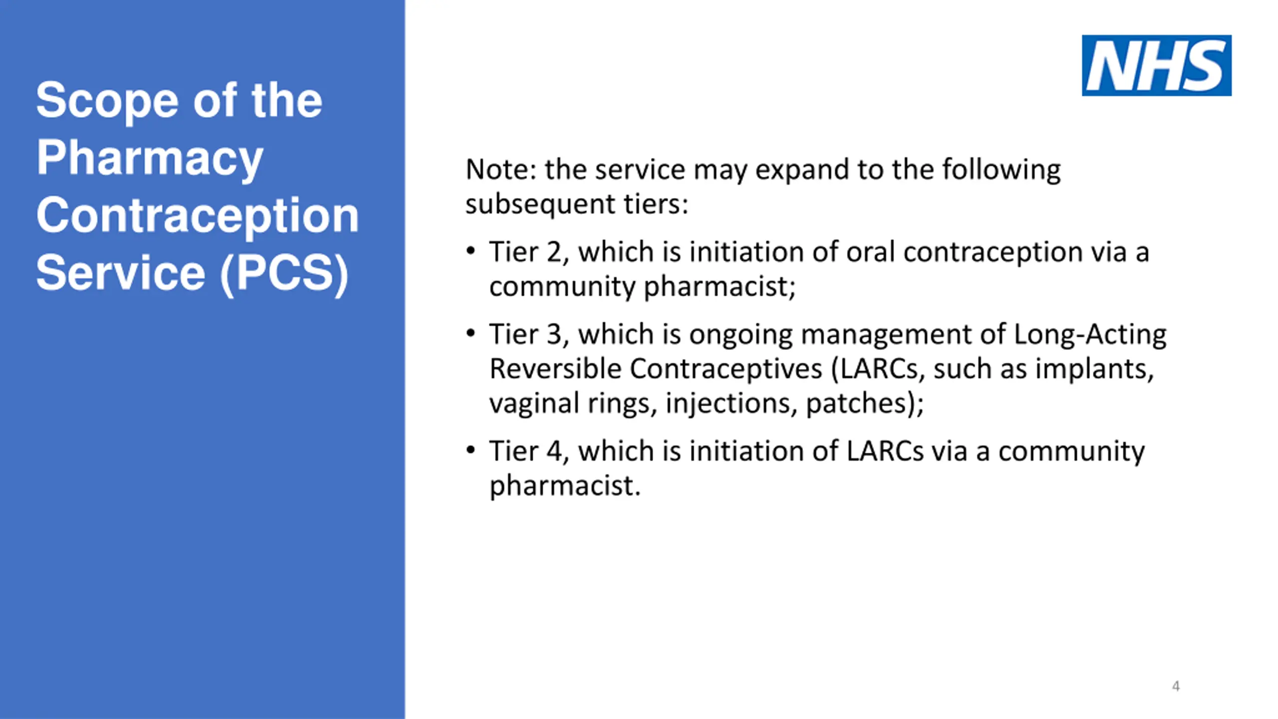 Scope of the Pharmacy Contraception Service (PCS) Note: the service may expand to the following subsequent tiers: Tier 2, which is initiation of oral contraception via a community pharmacist; Tier 3, which is ongoing management of Long-Acting Reversible Contraceptives (LARCs, such as implants, vaginal rings, injections, patches); Tier 4, which is initiation of LARCs via a community pharmacist. 4
