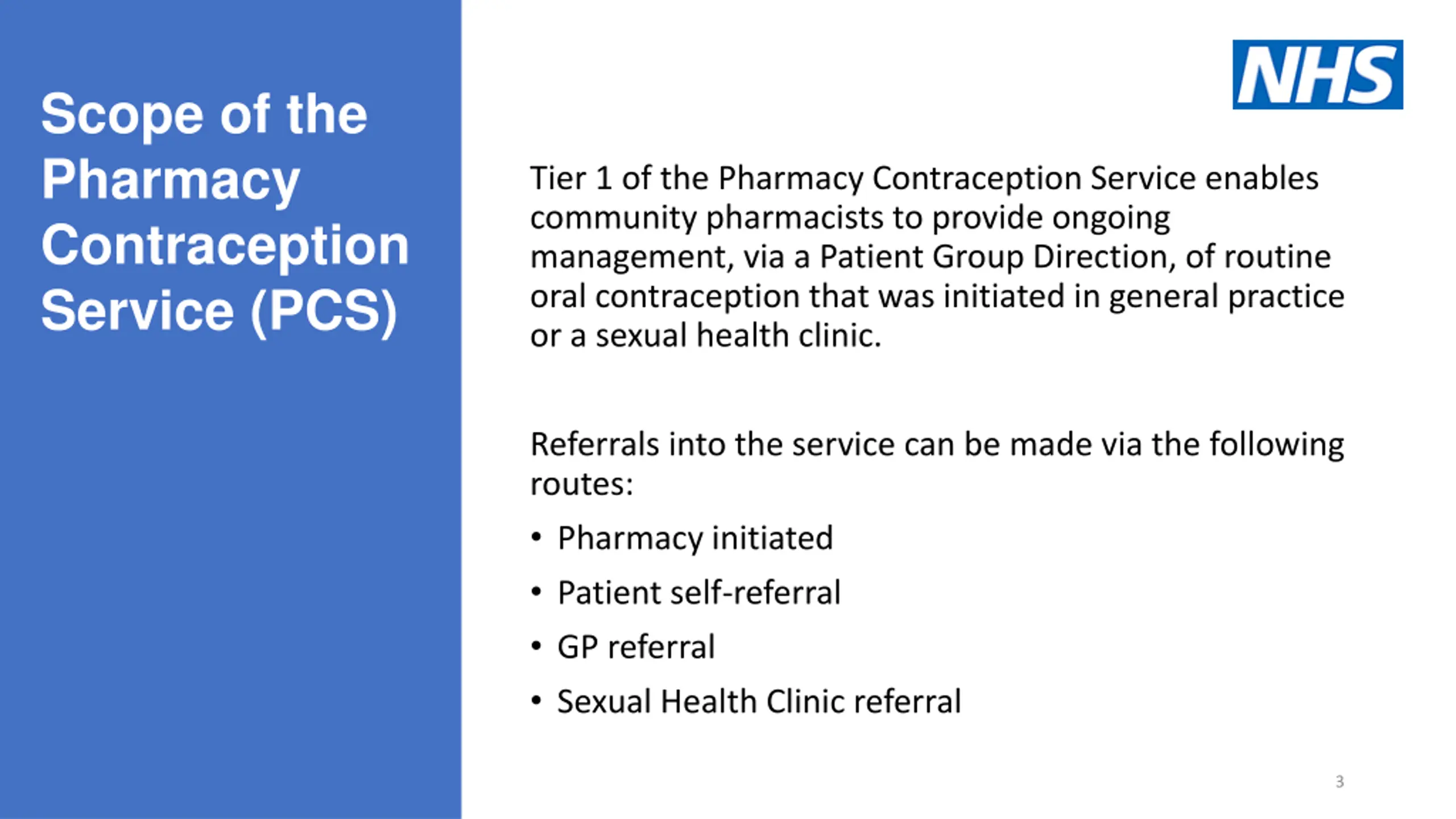 Scope of the Pharmacy Contraception Service (PCS) Tier 1 of the Pharmacy Contraception Service enables community pharmacists to provide ongoing management, via a Patient Group Direction, of routine oral contraception that was initiated in general practice or a sexual health clinic. Referrals into the service can be made via the following routes: Pharmacy initiated Patient self-referral GP referral Sexual Health Clinic referral 3