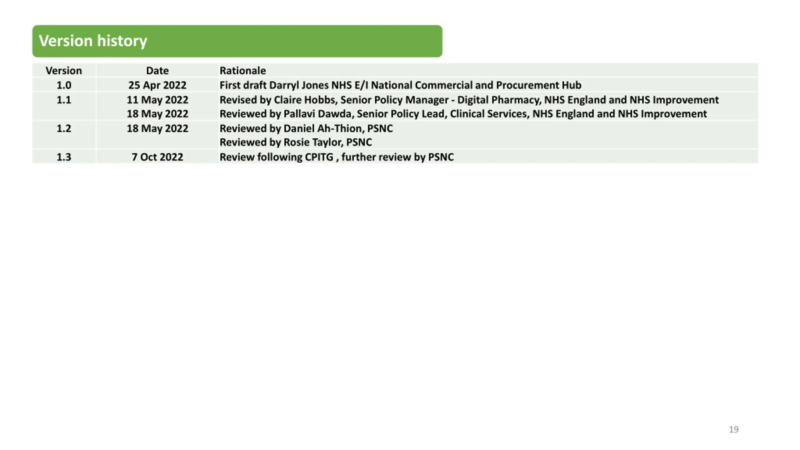 Version history Version 1.0 1.1 Date Rationale First draft Darryl Jones NHS E/I National Commercial and Procurement Hub Revised by Claire Hobbs, Senior Policy Manager - Digital Pharmacy, NHS England and NHS Improvement Reviewed by Pallavi Dawda, Senior Policy Lead, Clinical Services, NHS England and NHS Improvement Reviewed by Daniel Ah-Thion, PSNC Reviewed by Rosie Taylor, PSNC Review following CPITG , further review by PSNC 25 Apr 2022 11 May 2022 18 May 2022 18 May 2022 1.2 1.3 7 Oct 2022 19