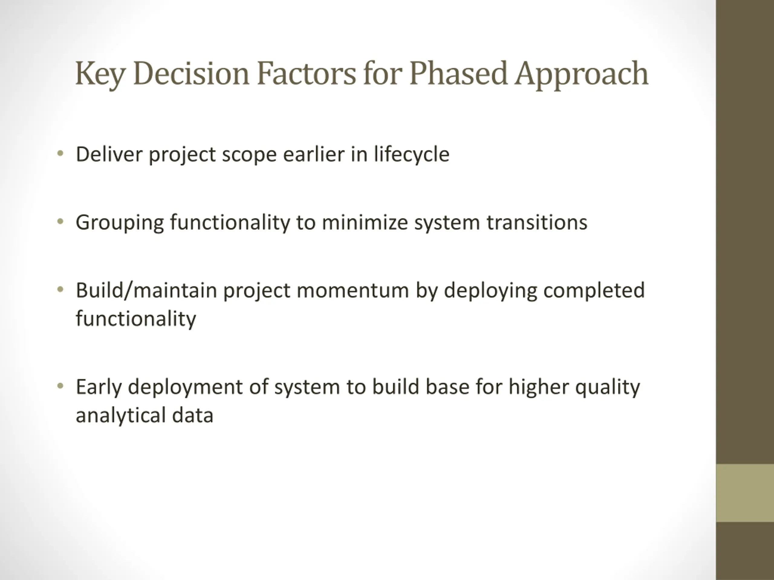 Key Decision Factors for Phased Approach Deliver project scope earlier in lifecycle Grouping functionality to minimize system transitions Build/maintain project momentum by deploying completed functionality Early deployment of system to build base for higher quality analytical data