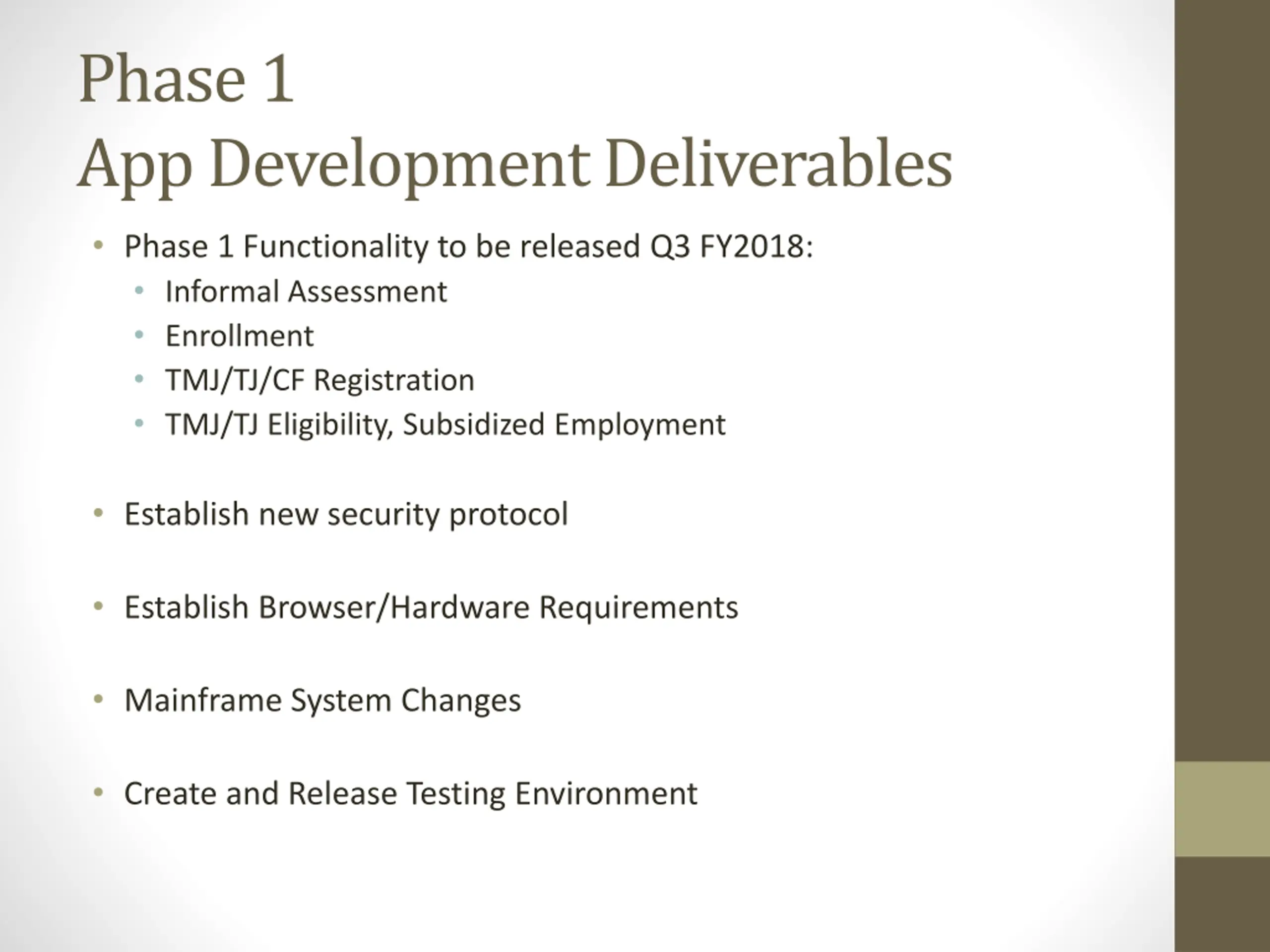 Phase 1 App Development Deliverables Phase 1 Functionality to be released Q3 FY2018: Informal Assessment Enrollment TMJ/TJ/CF Registration TMJ/TJ Eligibility, Subsidized Employment Establish new security protocol Establish Browser/Hardware Requirements Mainframe System Changes Create and Release Testing Environment