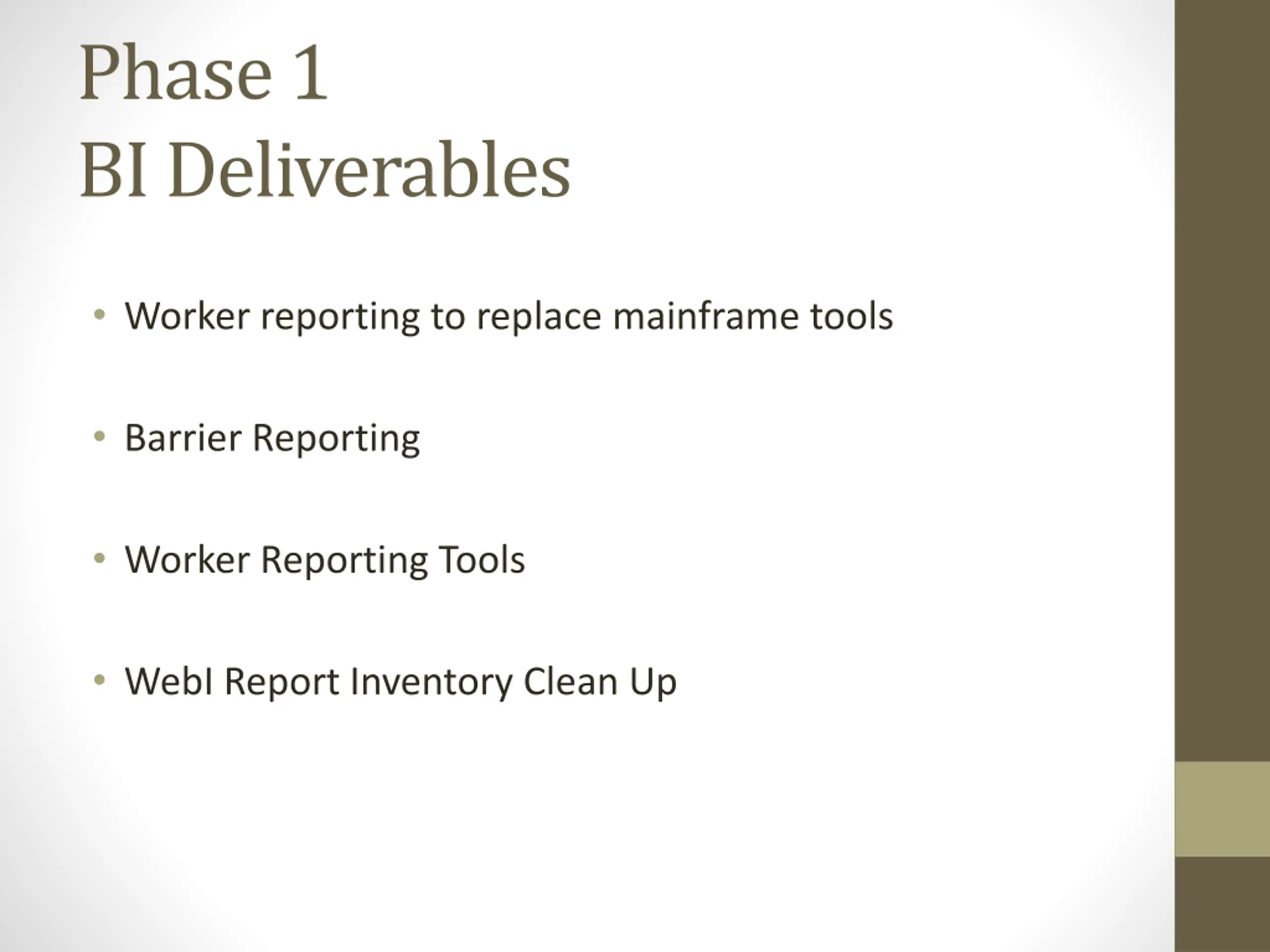 Phase 1 BI Deliverables Worker reporting to replace mainframe tools Barrier Reporting Worker Reporting Tools WebI Report Inventory Clean Up