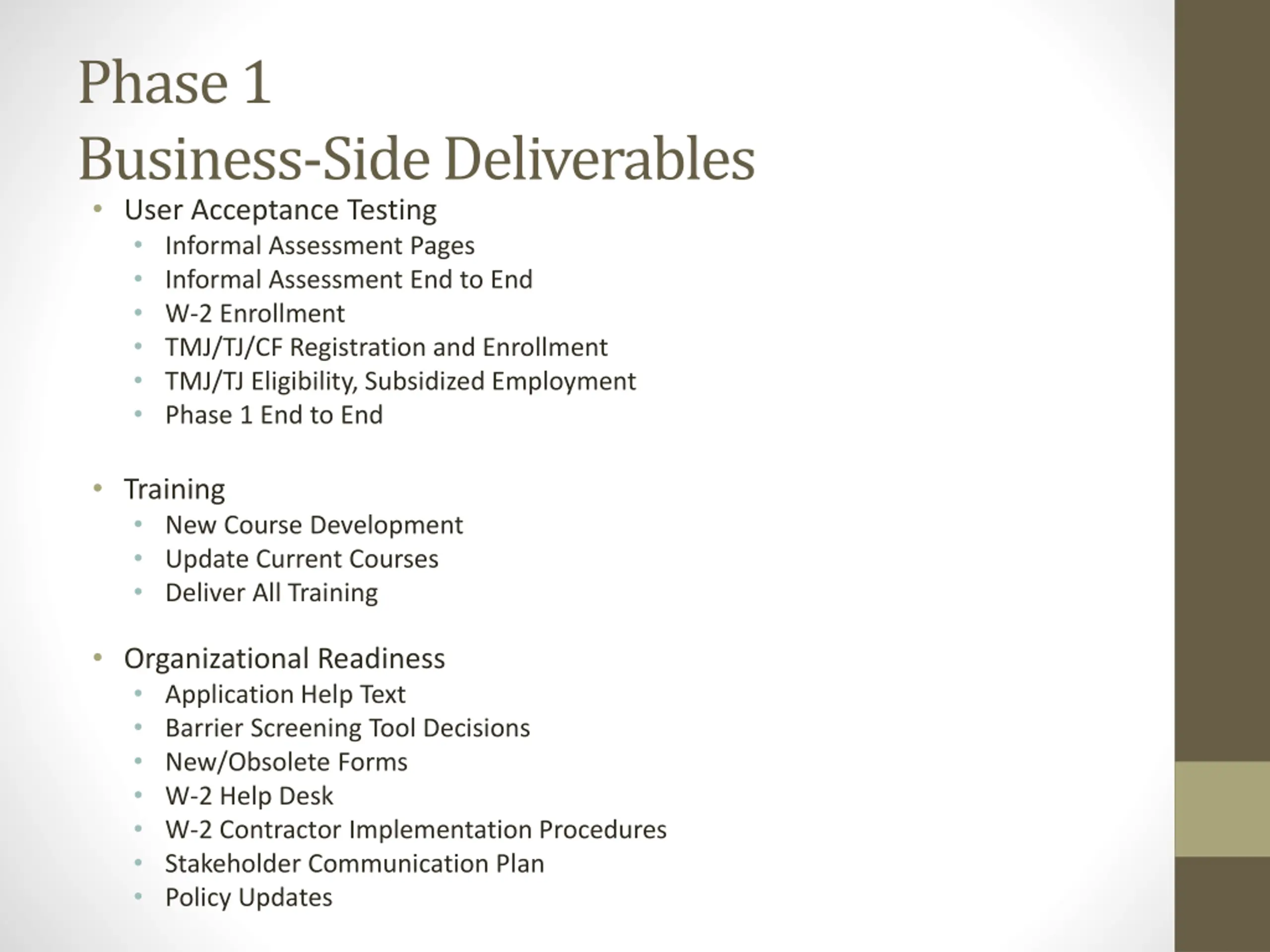 Phase 1 Business-Side Deliverables User Acceptance Testing Informal Assessment Pages Informal Assessment End to End W-2 Enrollment TMJ/TJ/CF Registration and Enrollment TMJ/TJ Eligibility, Subsidized Employment Phase 1 End to End Training New Course Development Update Current Courses Deliver All Training Organizational Readiness Application Help Text Barrier Screening Tool Decisions New/Obsolete Forms W-2 Help Desk W-2 Contractor Implementation Procedures Stakeholder Communication Plan Policy Updates