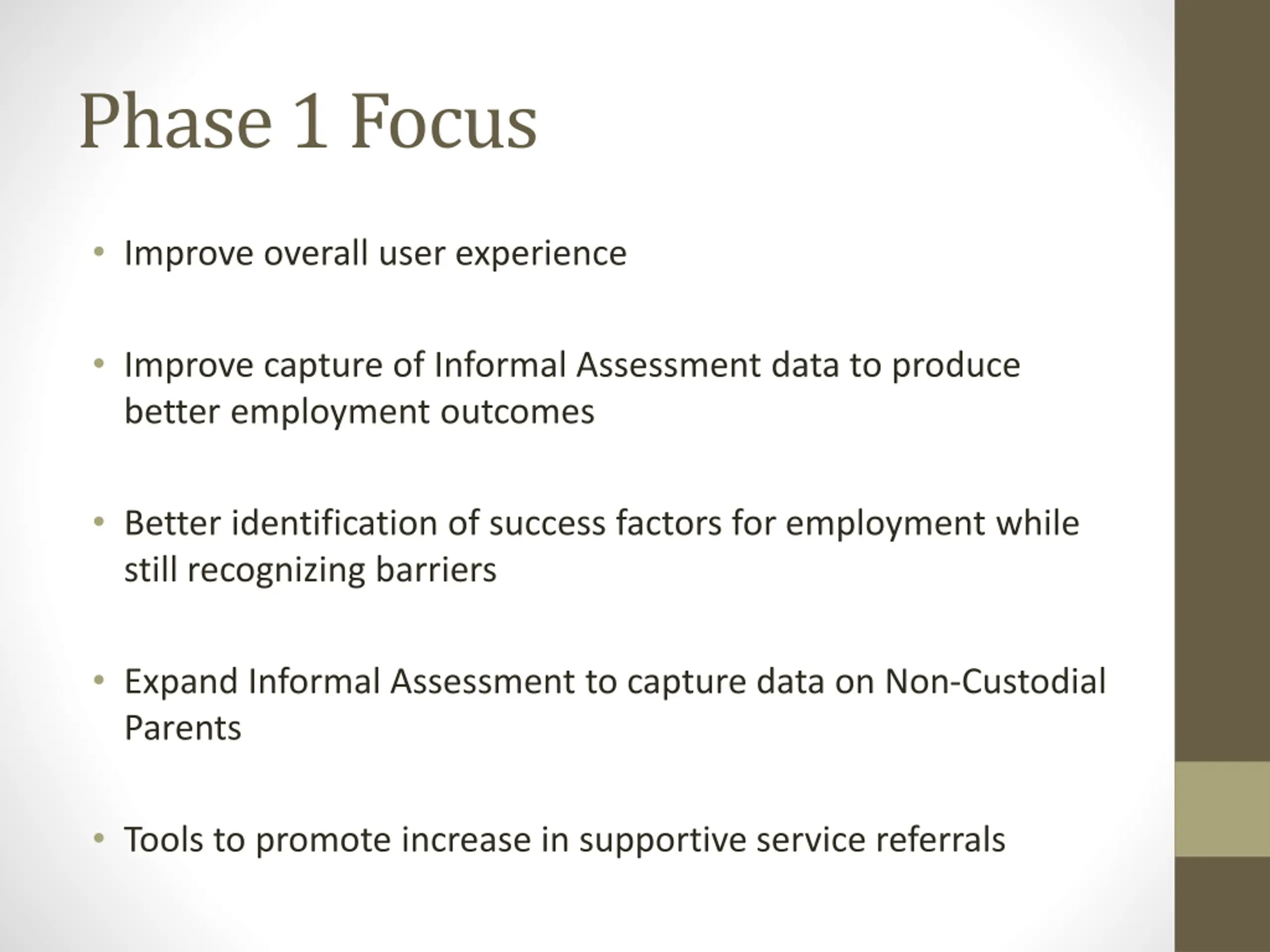 Phase 1 Focus Improve overall user experience Improve capture of Informal Assessment data to produce better employment outcomes Better identification of success factors for employment while still recognizing barriers Expand Informal Assessment to capture data on Non-Custodial Parents Tools to promote increase in supportive service referrals