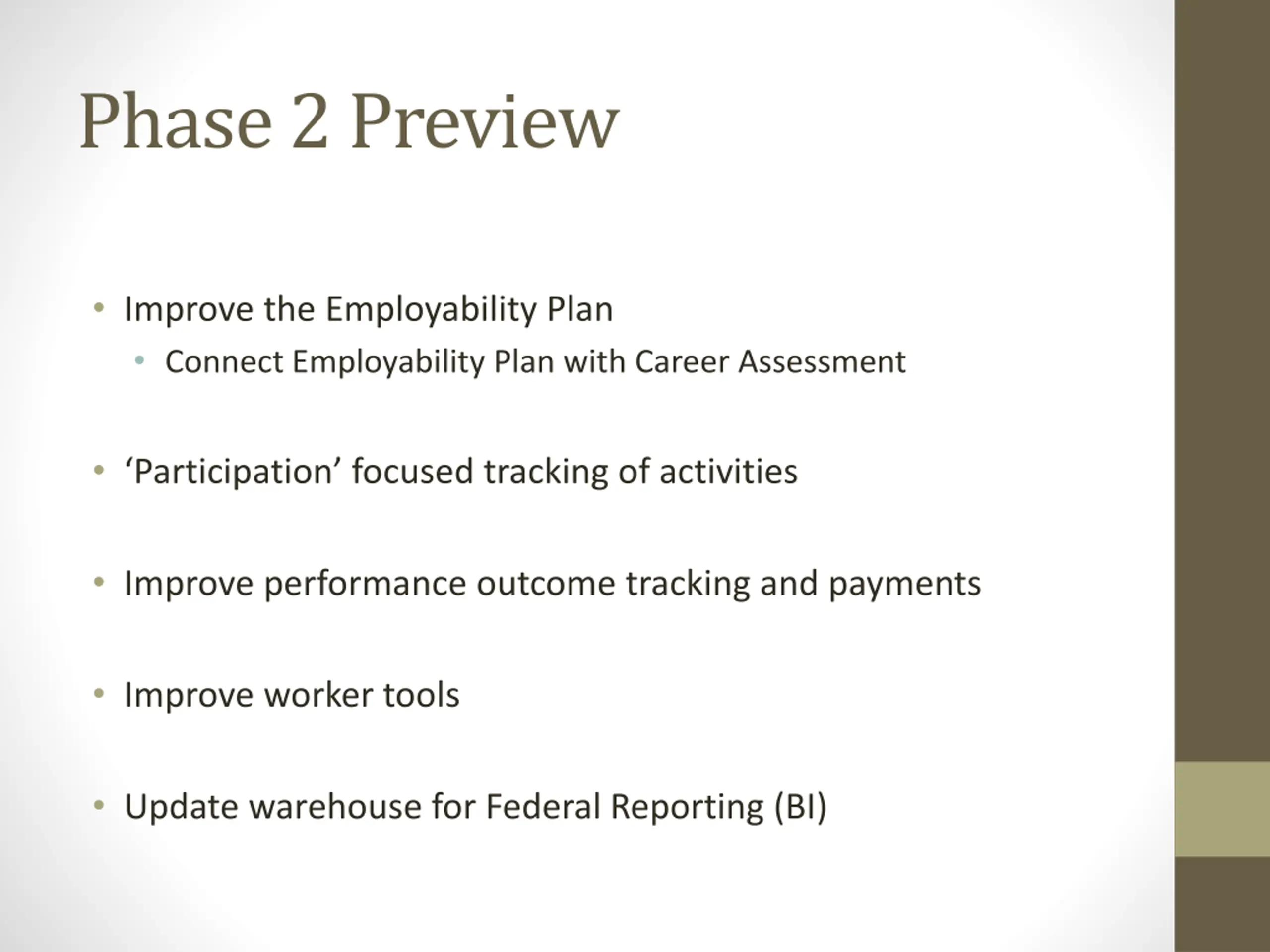 Phase 2 Preview Improve the Employability Plan Connect Employability Plan with Career Assessment Participation focused tracking of activities Improve performance outcome tracking and payments Improve worker tools Update warehouse for Federal Reporting (BI)
