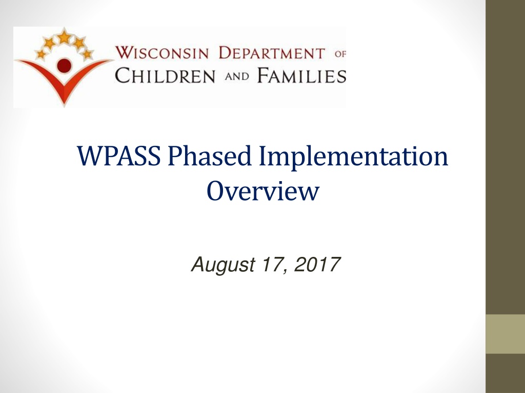 WPASS Scope Recap Replacement of Mainframe Functionality Target Programs: Wisconsin Works (W2) Transitional Jobs (TJ)/Transform Milwaukee Jobs (TMJ) Children First (CF) Target Functionality System Enrollment Participant Assessment Employability Planning Activity Assignment & Tracking Worker Tools and Supportive Services W-2 Performance Outcome Payments TMJ/TJ/CF Registration TMJ/TJ Eligibility, Subsidized Employment