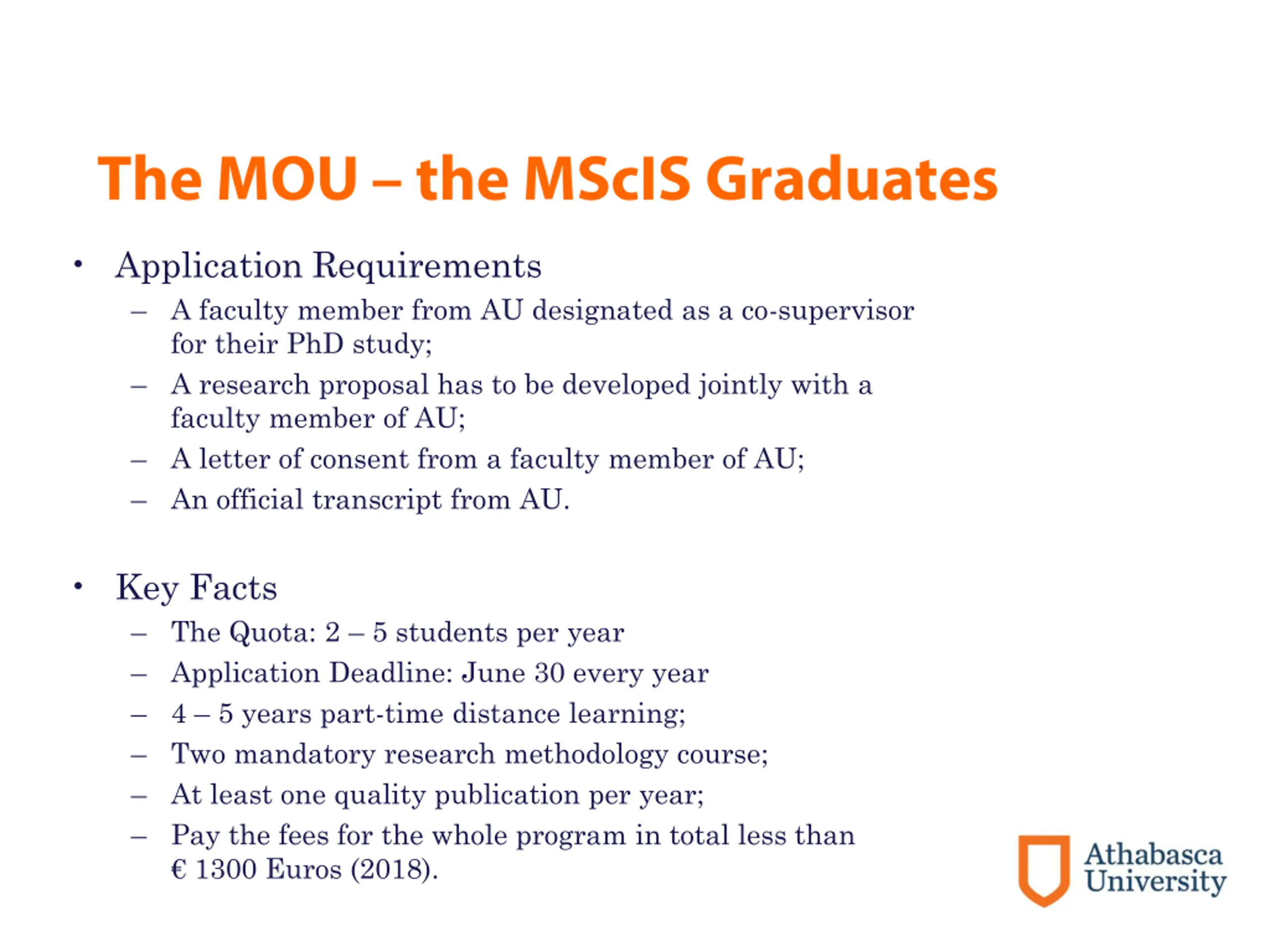 Application Requirements A faculty member from AU designated as a co-supervisor for their PhD study; A research proposal has to be developed jointly with a faculty member of AU; A letter of consent from a faculty member of AU; An official transcript from AU. Key Facts The Quota: 2 5 students per year Application Deadline: June 30 every year 4 5 years part-time distance learning; Two mandatory research methodology course; At least one quality publication per year; Pay the fees for the whole program in total less than 1300 Euros (2018).
