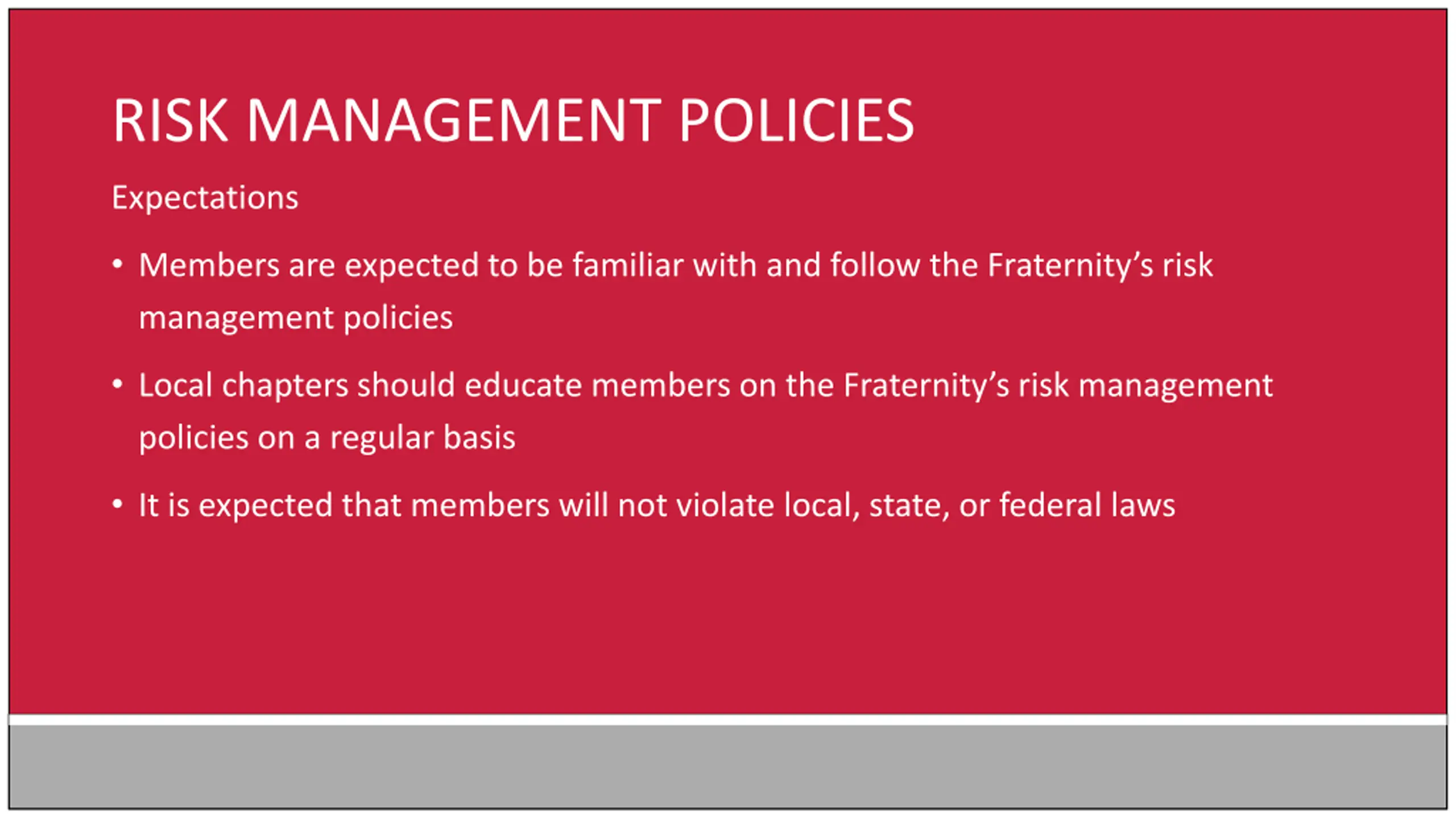 RISK MANAGEMENT POLICIES Expectations Members are expected to be familiar with and follow the Fraternity s risk management policies Local chapters should educate members on the Fraternity s risk management policies on a regular basis It is expected that members will not violate local, state, or federal laws