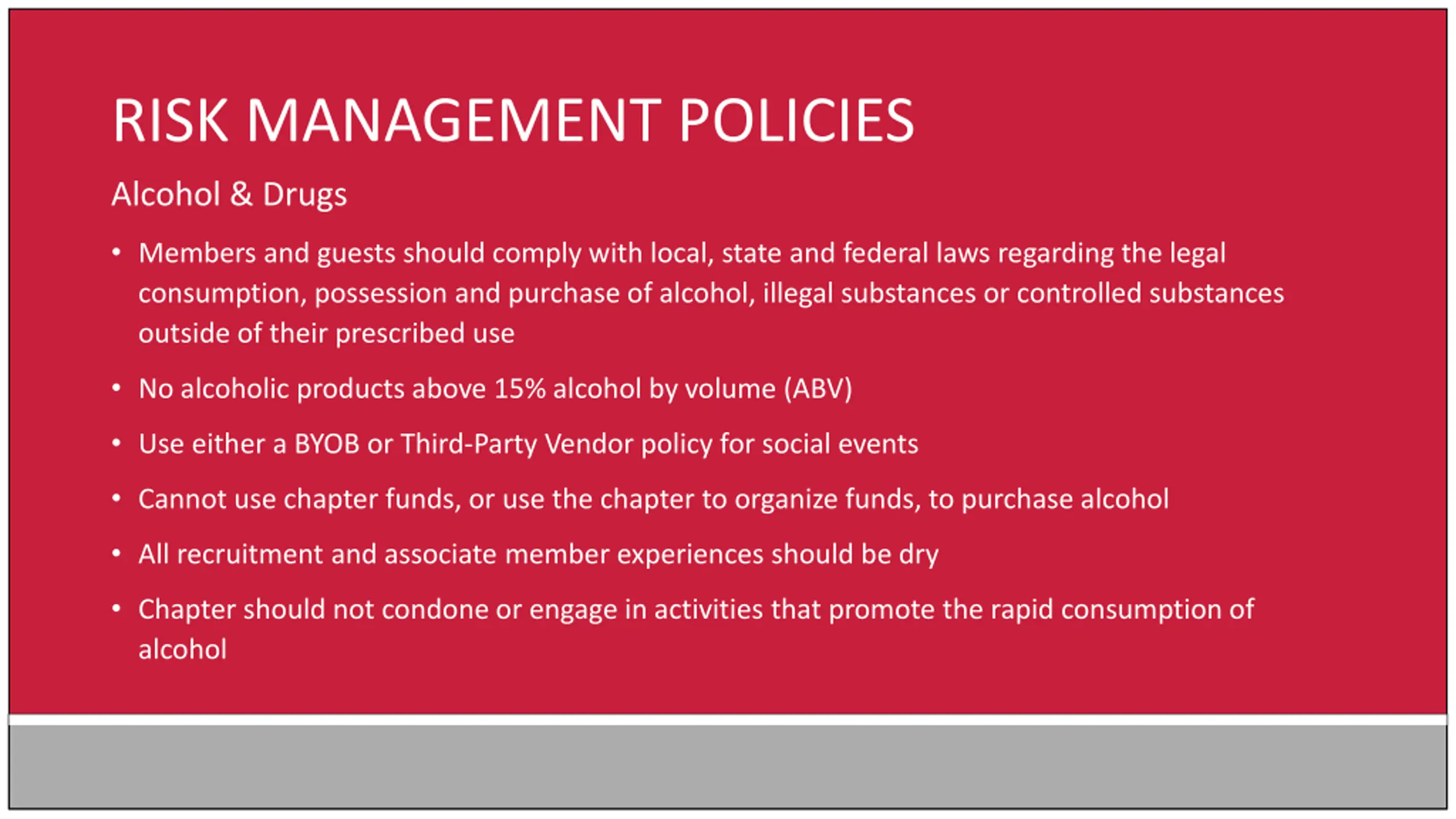 RISK MANAGEMENT POLICIES Alcohol & Drugs Members and guests should comply with local, state and federal laws regarding the legal consumption, possession and purchase of alcohol, illegal substances or controlled substances outside of their prescribed use No alcoholic products above 15% alcohol by volume (ABV) Use either a BYOB or Third-Party Vendor policy for social events Cannot use chapter funds, or use the chapter to organize funds, to purchase alcohol All recruitment and associate member experiences should be dry Chapter should not condone or engage in activities that promote the rapid consumption of alcohol