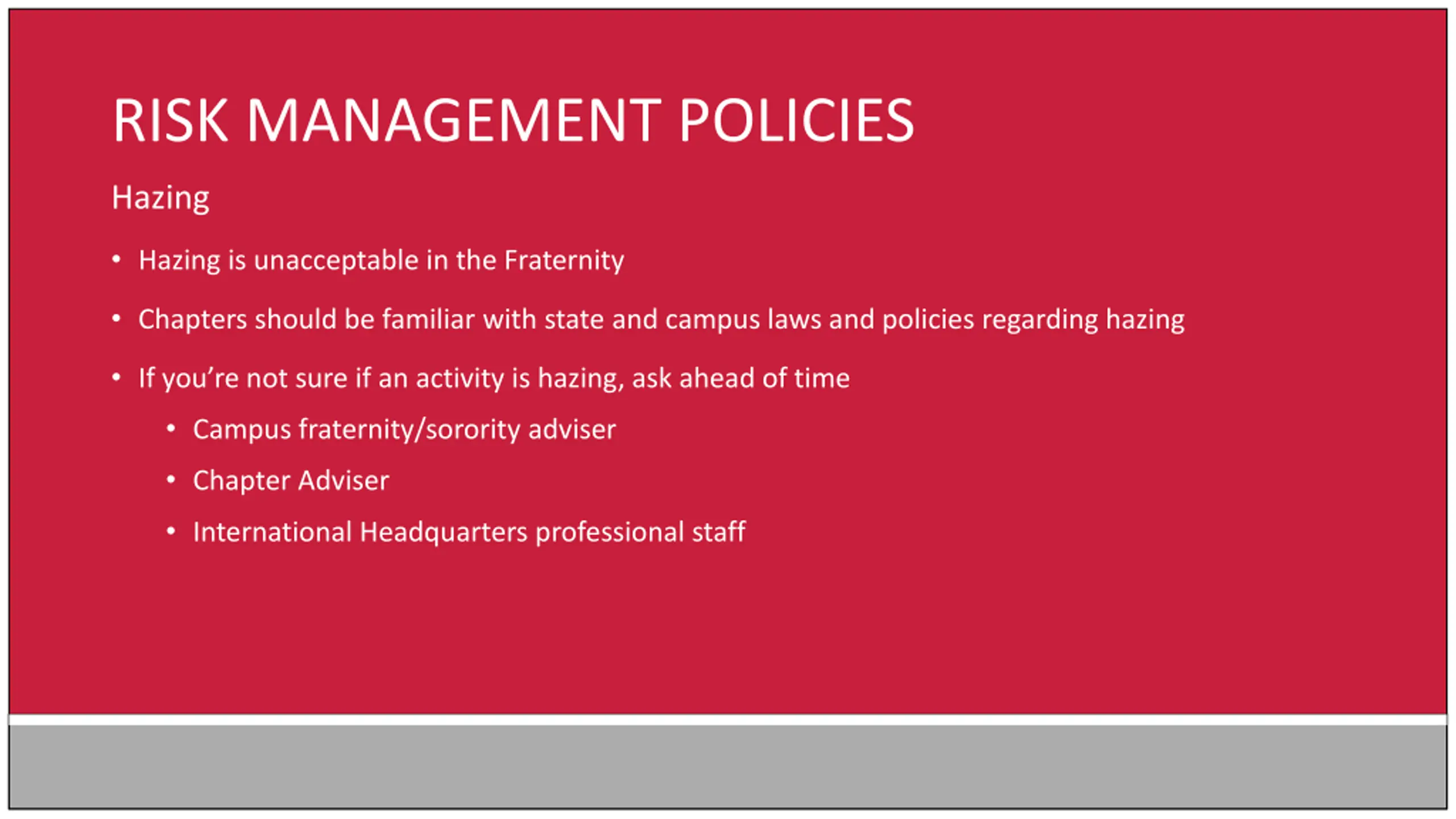 RISK MANAGEMENT POLICIES Hazing Hazing is unacceptable in the Fraternity Chapters should be familiar with state and campus laws and policies regarding hazing If you re not sure if an activity is hazing, ask ahead of time Campus fraternity/sorority adviser Chapter Adviser International Headquarters professional staff