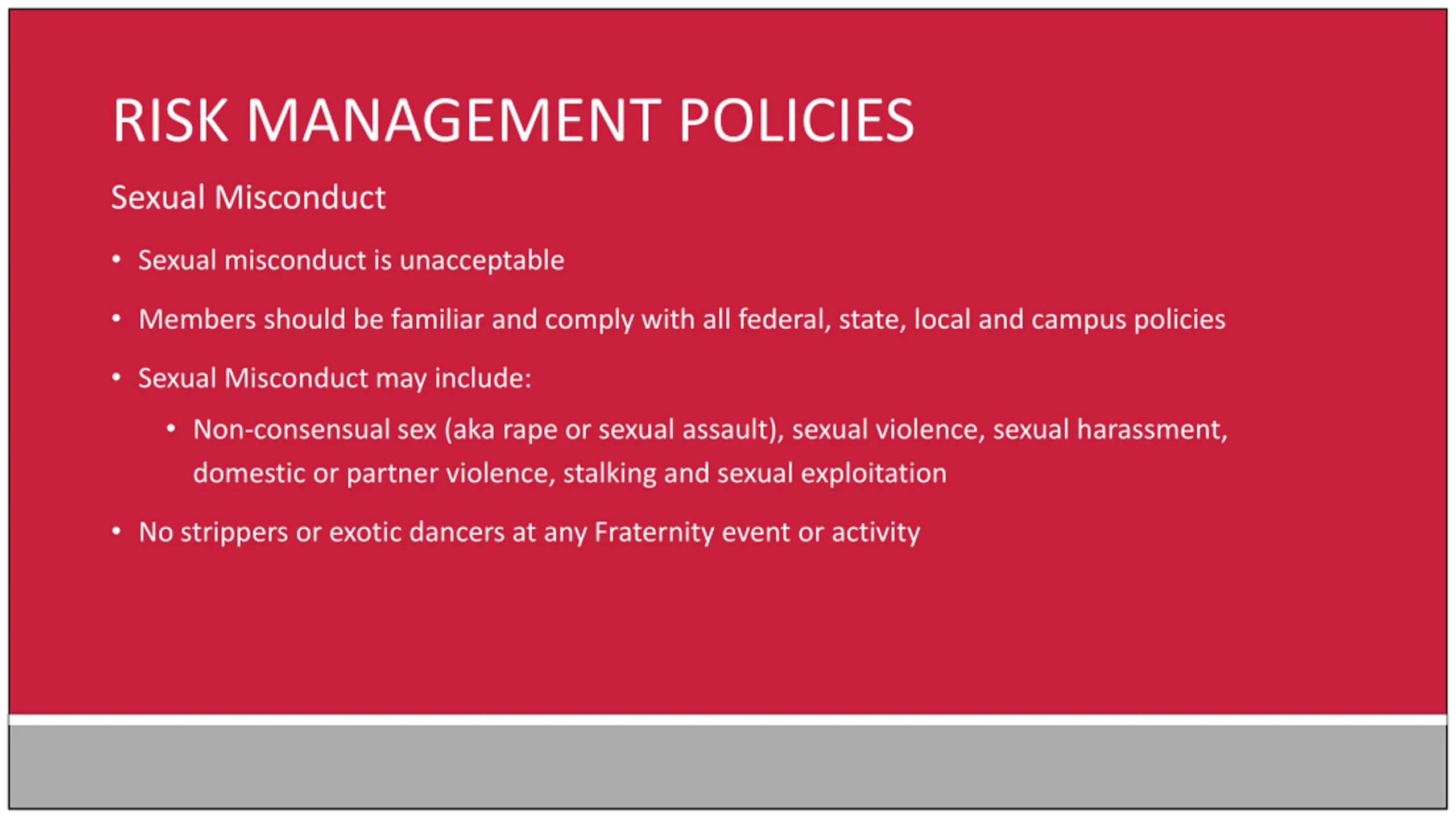 RISK MANAGEMENT POLICIES Sexual Misconduct Sexual misconduct is unacceptable Members should be familiar and comply with all federal, state, local and campus policies Sexual Misconduct may include: Non-consensual sex (aka rape or sexual assault), sexual violence, sexual harassment, domestic or partner violence, stalking and sexual exploitation No strippers or exotic dancers at any Fraternity event or activity
