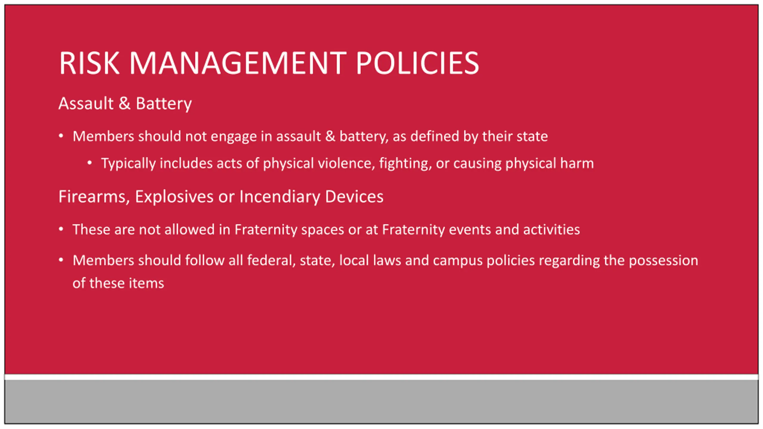 RISK MANAGEMENT POLICIES Assault & Battery Members should not engage in assault & battery, as defined by their state Typically includes acts of physical violence, fighting, or causing physical harm Firearms, Explosives or Incendiary Devices These are not allowed in Fraternity spaces or at Fraternity events and activities Members should follow all federal, state, local laws and campus policies regarding the possession of these items