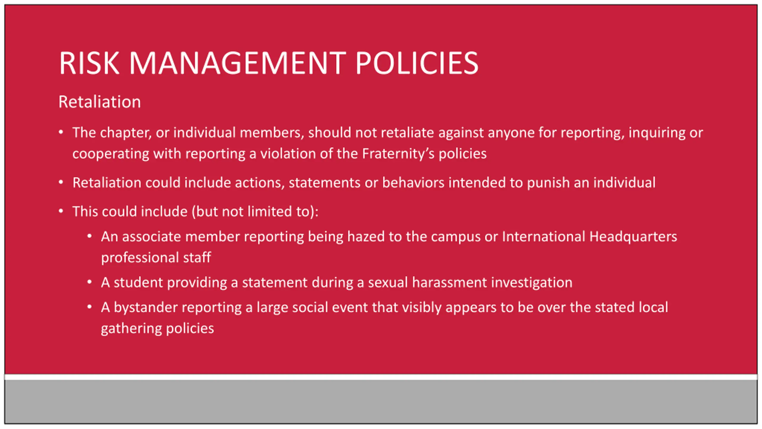 RISK MANAGEMENT POLICIES Retaliation The chapter, or individual members, should not retaliate against anyone for reporting, inquiring or cooperating with reporting a violation of the Fraternity s policies Retaliation could include actions, statements or behaviors intended to punish an individual This could include (but not limited to): An associate member reporting being hazed to the campus or International Headquarters professional staff A student providing a statement during a sexual harassment investigation A bystander reporting a large social event that visibly appears to be over the stated local gathering policies