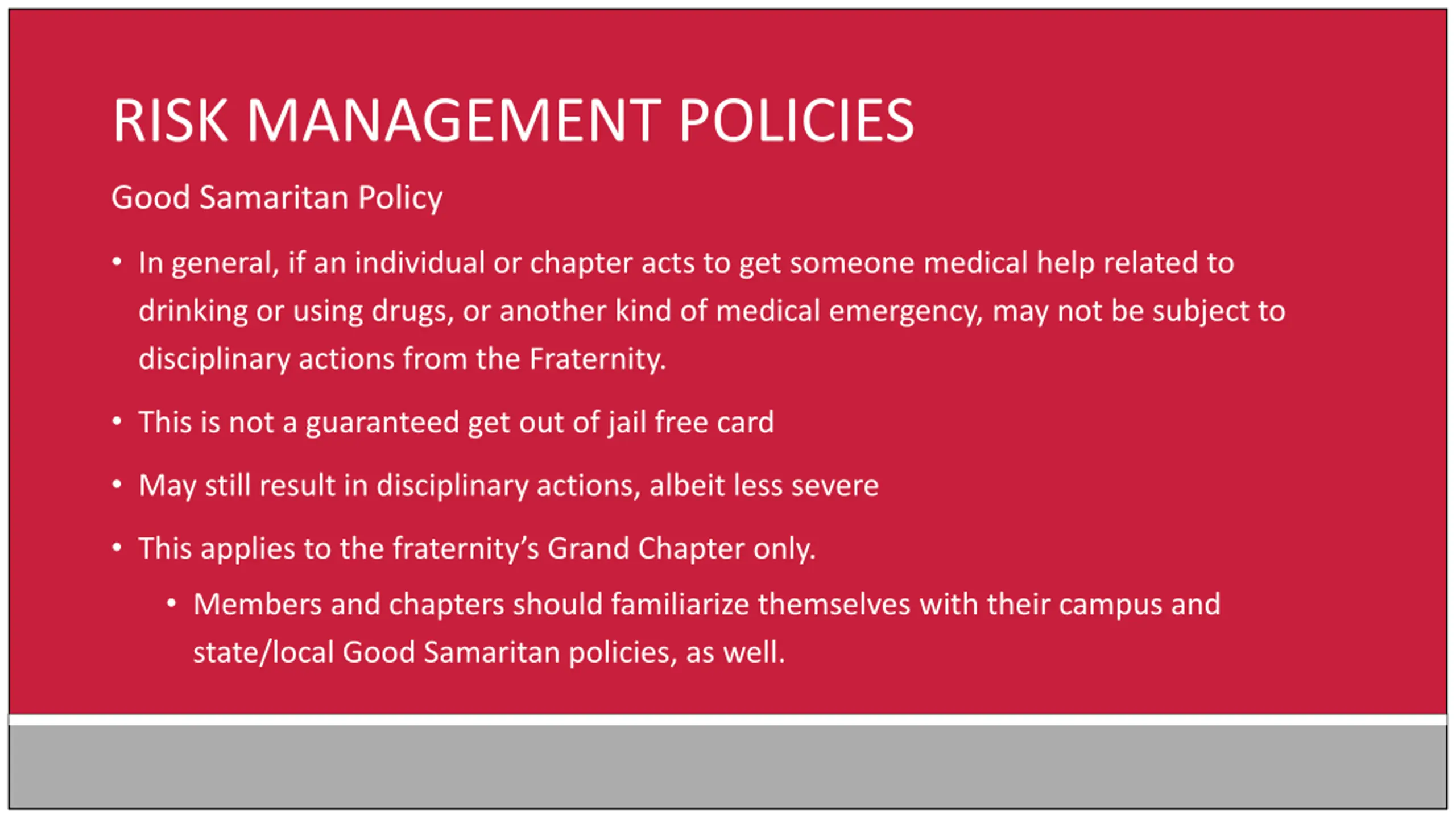 RISK MANAGEMENT POLICIES Good Samaritan Policy In general, if an individual or chapter acts to get someone medical help related to drinking or using drugs, or another kind of medical emergency, may not be subject to disciplinary actions from the Fraternity. This is not a guaranteed get out of jail free card May still result in disciplinary actions, albeit less severe This applies to the fraternity s Grand Chapter only. Members and chapters should familiarize themselves with their campus and state/local Good Samaritan policies, as well.