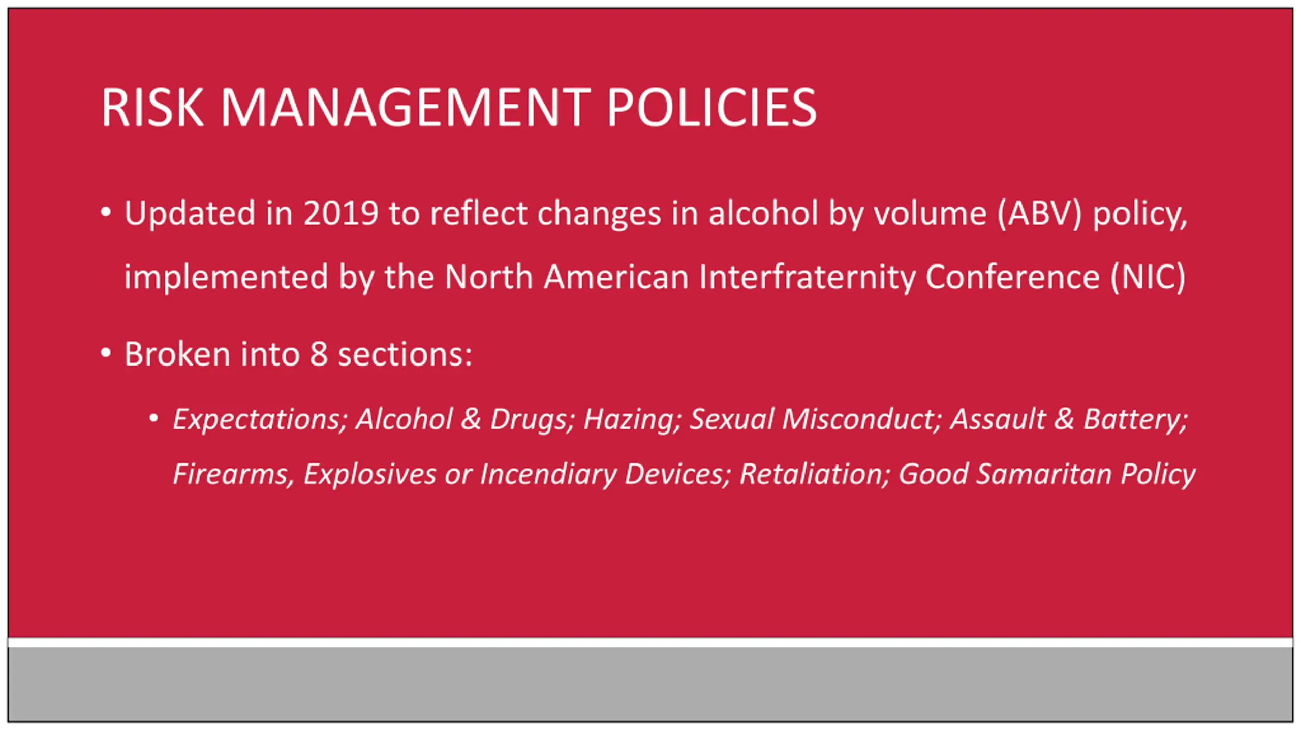 RISK MANAGEMENT POLICIES Updated in 2019 to reflect changes in alcohol by volume (ABV) policy, implemented by the North American Interfraternity Conference (NIC) Broken into 8 sections: Expectations; Alcohol & Drugs; Hazing; Sexual Misconduct; Assault & Battery; Firearms, Explosives or Incendiary Devices; Retaliation; Good Samaritan Policy