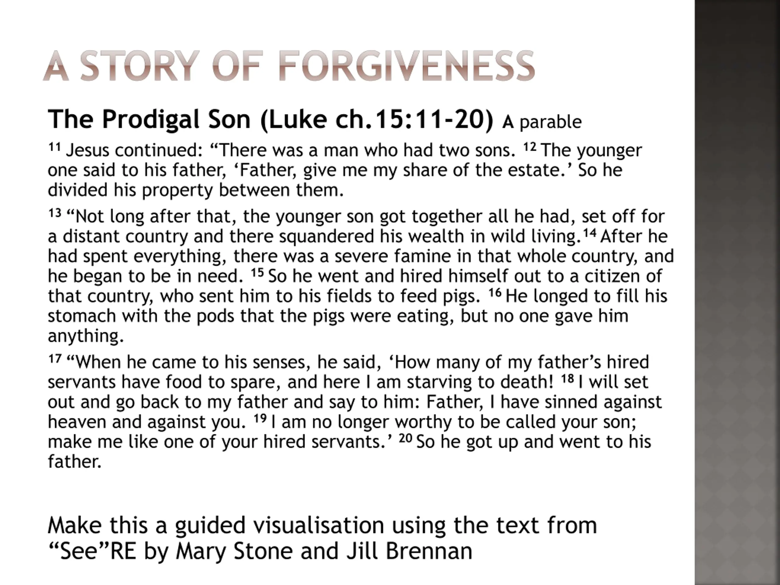 A STORY OF FORGIVENESS The Prodigal Son (Luke ch.15:11-20) A parable 11Jesus continued: There was a man who had two sons.12The younger one said to his father, Father, give me my share of the estate. So he divided his property between them. 13 Not long after that, the younger son got together all he had, set off for a distant country and there squandered his wealth in wild living.14After he had spent everything, there was a severe famine in that whole country, and he began to be in need.15So he went and hired himself out to a citizen of that country, who sent him to his fields to feed pigs.16He longed to fill his stomach with the pods that the pigs were eating, but no one gave him anything. 17 When he came to his senses, he said, How many of my father s hired servants have food to spare, and here I am starving to death!18I will set out and go back to my father and say to him: Father, I have sinned against heaven and against you.19I am no longer worthy to be called your son; make me like one of your hired servants. 20So he got up and went to his father. Make this a guided visualisation using the text from See RE by Mary Stone and Jill Brennan