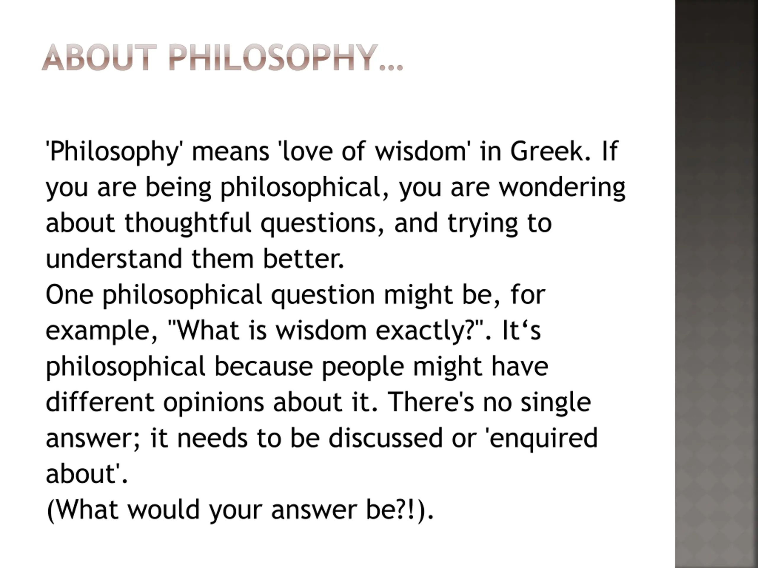ABOUT PHILOSOPHY 'Philosophy' means 'love of wisdom' in Greek. If you are being philosophical, you are wondering about thoughtful questions, and trying to understand them better. One philosophical question might be, for example, "What is wisdom exactly?". It s philosophical because people might have different opinions about it. There's no single answer; it needs to be discussed or 'enquired about'. (What would your answer be?!).