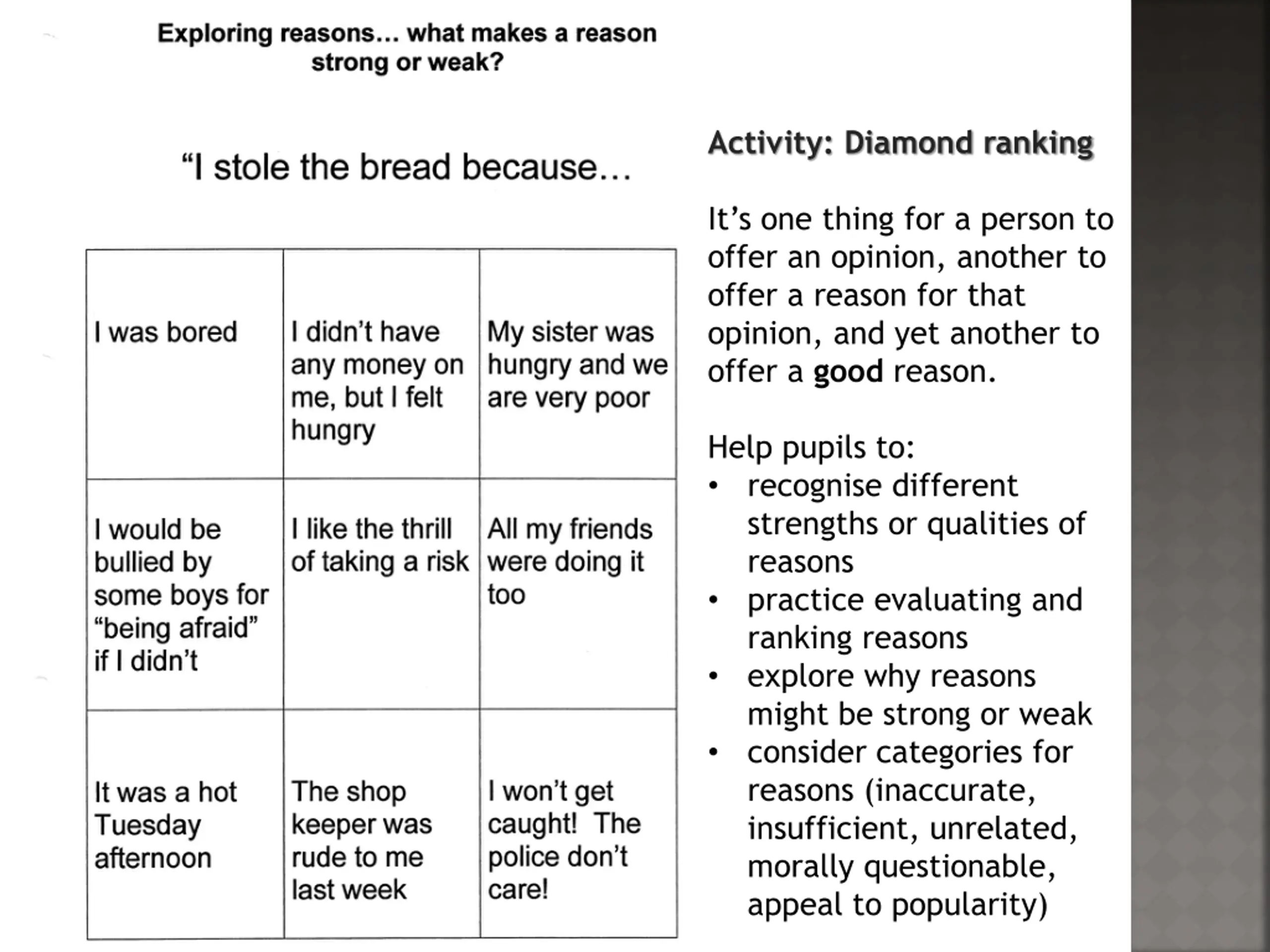Activity: Diamond ranking It s one thing for a person to offer an opinion, another to offer a reason for that opinion, and yet another to offer a good reason. Help pupils to: recognise different strengths or qualities of reasons practice evaluating and ranking reasons explore why reasons might be strong or weak consider categories for reasons (inaccurate, insufficient, unrelated, morally questionable, appeal to popularity)