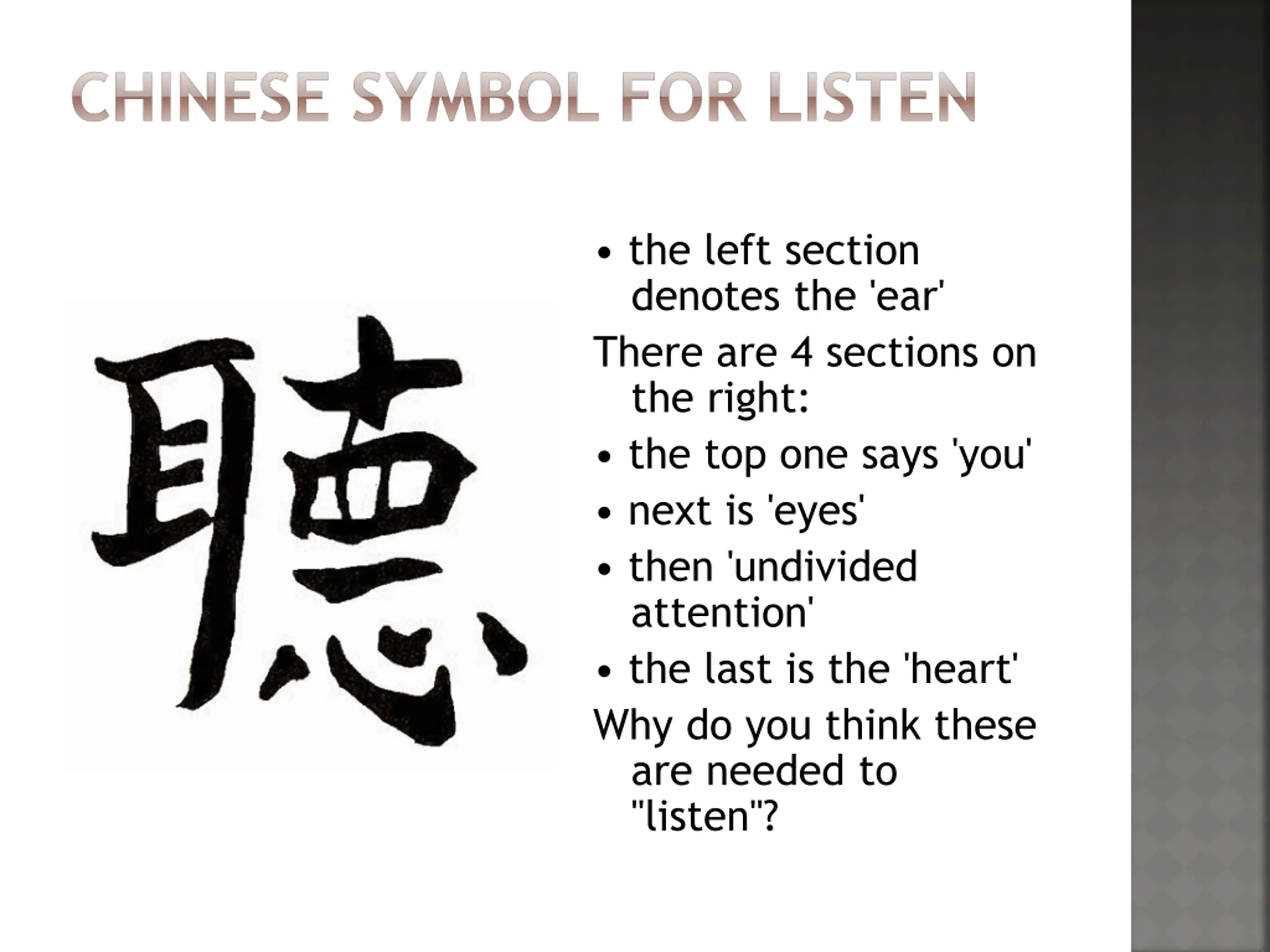 CHINESE SYMBOL FOR LISTEN the left section denotes the 'ear' There are 4 sections on the right: the top one says 'you' next is 'eyes' then 'undivided attention' the last is the 'heart' Why do you think these are needed to "listen"?