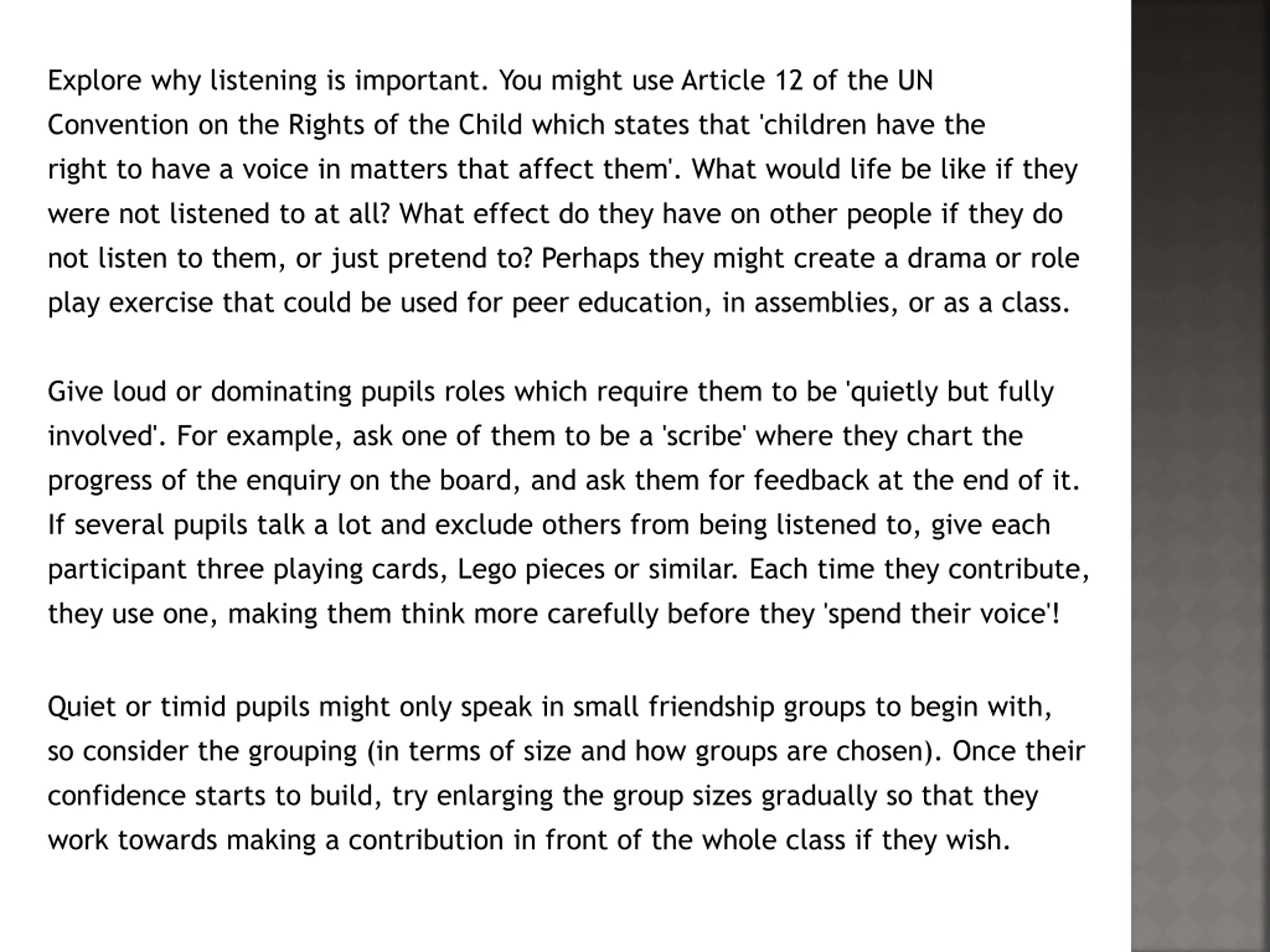 Explore why listening is important. You might use Article 12 of the UN Convention on the Rights of the Child which states that 'children have the right to have a voice in matters that affect them'. What would life be like if they were not listened to at all? What effect do they have on other people if they do not listen to them, or just pretend to? Perhaps they might create a drama or role play exercise that could be used for peer education, in assemblies, or as a class. Give loud or dominating pupils roles which require them to be 'quietly but fully involved'. For example, ask one of them to be a 'scribe' where they chart the progress of the enquiry on the board, and ask them for feedback at the end of it. If several pupils talk a lot and exclude others from being listened to, give each participant three playing cards, Lego pieces or similar. Each time they contribute, they use one, making them think more carefully before they 'spend their voice'! Quiet or timid pupils might only speak in small friendship groups to begin with, so consider the grouping (in terms of size and how groups are chosen). Once their confidence starts to build, try enlarging the group sizes gradually so that they work towards making a contribution in front of the whole class if they wish.