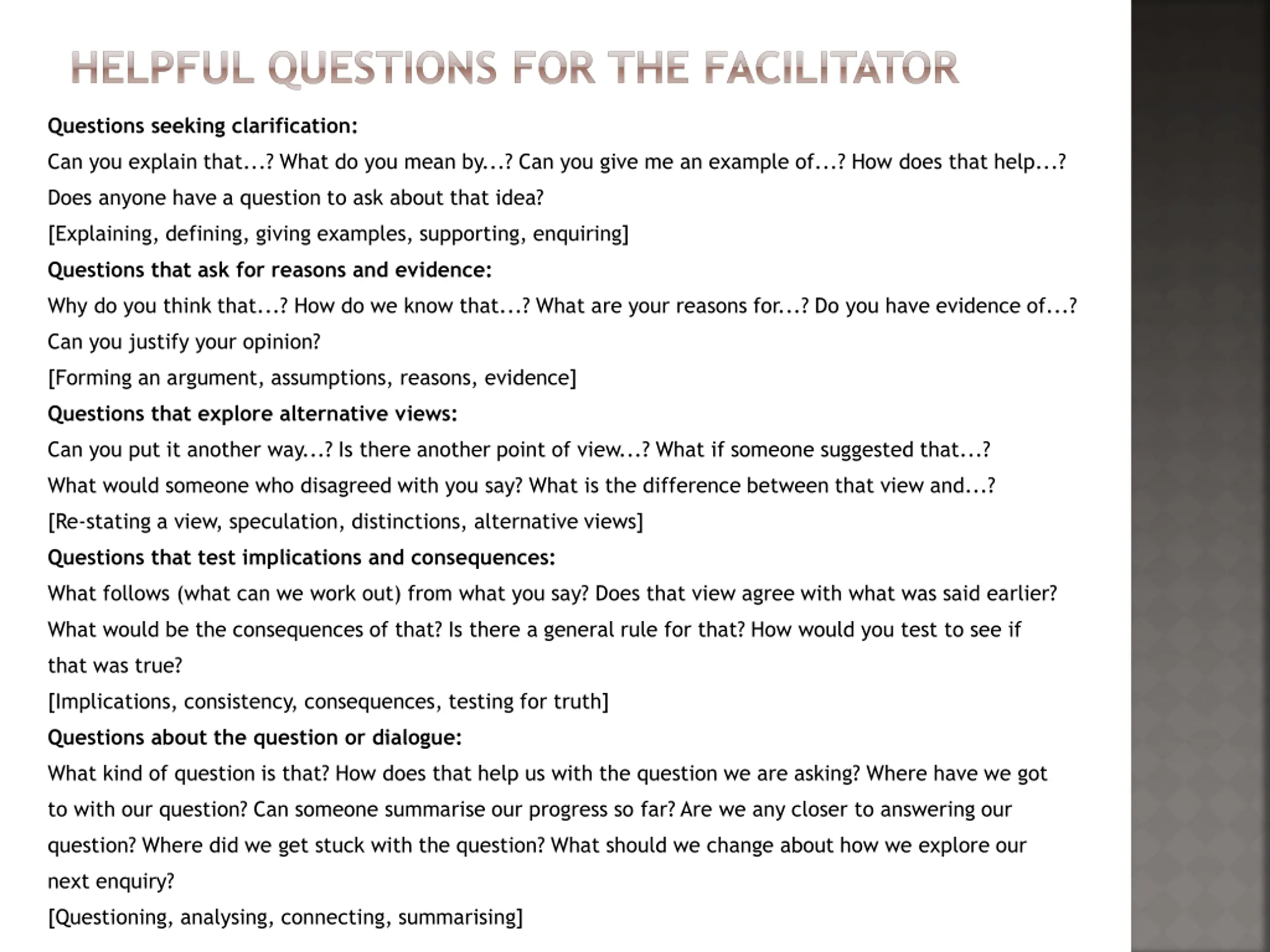 HELPFUL QUESTIONS FOR THE FACILITATOR Questions seeking clarification: Can you explain that...? What do you mean by...? Can you give me an example of...? How does that help...? Does anyone have a question to ask about that idea? [Explaining, defining, giving examples, supporting, enquiring] Questions that ask for reasons and evidence: Why do you think that...? How do we know that...? What are your reasons for...? Do you have evidence of...? Can you justify your opinion? [Forming an argument, assumptions, reasons, evidence] Questions that explore alternative views: Can you put it another way...? Is there another point of view...? What if someone suggested that...? What would someone who disagreed with you say? What is the difference between that view and...? [Re-stating a view, speculation, distinctions, alternative views] Questions that test implications and consequences: What follows (what can we work out) from what you say? Does that view agree with what was said earlier? What would be the consequences of that? Is there a general rule for that? How would you test to see if that was true? [Implications, consistency, consequences, testing for truth] Questions about the question or dialogue: What kind of question is that? How does that help us with the question we are asking? Where have we got to with our question? Can someone summarise our progress so far? Are we any closer to answering our question? Where did we get stuck with the question? What should we change about how we explore our next enquiry? [Questioning, analysing, connecting, summarising]