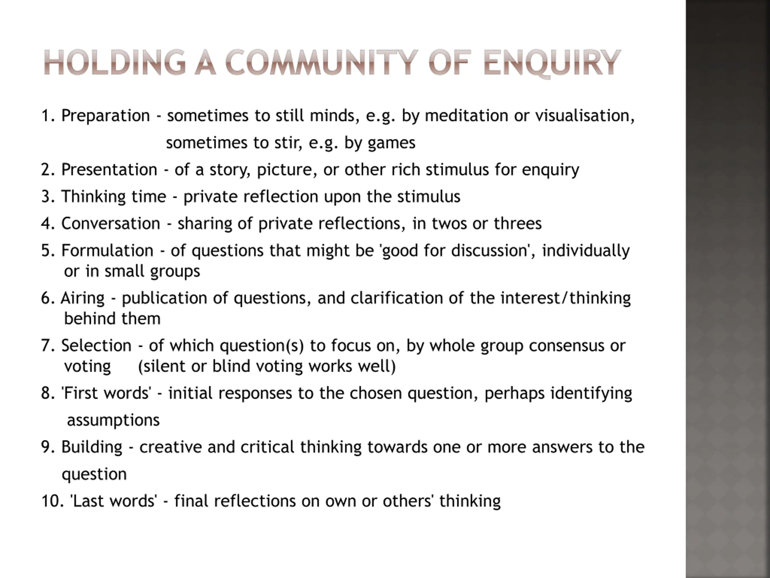 HOLDING A COMMUNITY OF ENQUIRY 1. Preparation - sometimes to still minds, e.g. by meditation or visualisation, sometimes to stir, e.g. by games 2. Presentation - of a story, picture, or other rich stimulus for enquiry 3. Thinking time - private reflection upon the stimulus 4. Conversation - sharing of private reflections, in twos or threes 5. Formulation - of questions that might be 'good for discussion', individually or in small groups 6. Airing - publication of questions, and clarification of the interest/thinking behind them 7. Selection - of which question(s) to focus on, by whole group consensus or voting (silent or blind voting works well) 8. 'First words' - initial responses to the chosen question, perhaps identifying assumptions 9. Building - creative and critical thinking towards one or more answers to the question 10. 'Last words' - final reflections on own or others' thinking