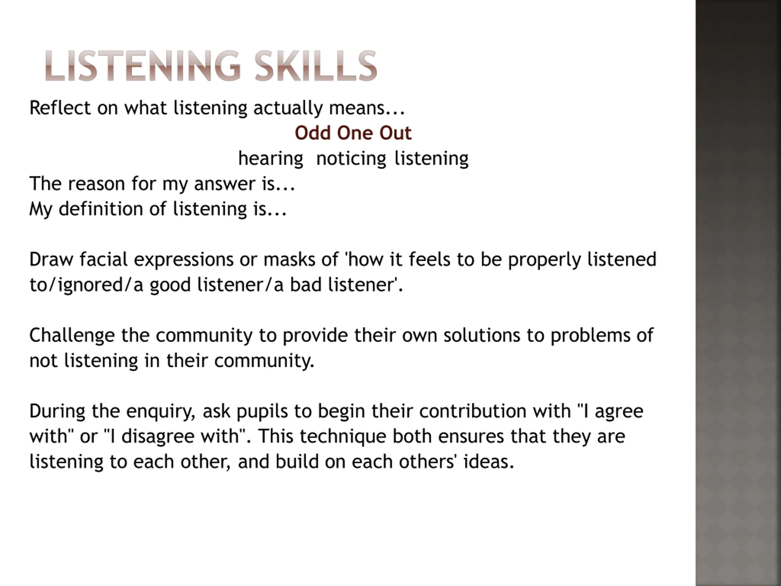 LISTENING SKILLS Reflect on what listening actually means... Odd One Out hearing noticing listening The reason for my answer is... My definition of listening is... Draw facial expressions or masks of 'how it feels to be properly listened to/ignored/a good listener/a bad listener'. Challenge the community to provide their own solutions to problems of not listening in their community. During the enquiry, ask pupils to begin their contribution with "I agree with" or "I disagree with". This technique both ensures that they are listening to each other, and build on each others' ideas.
