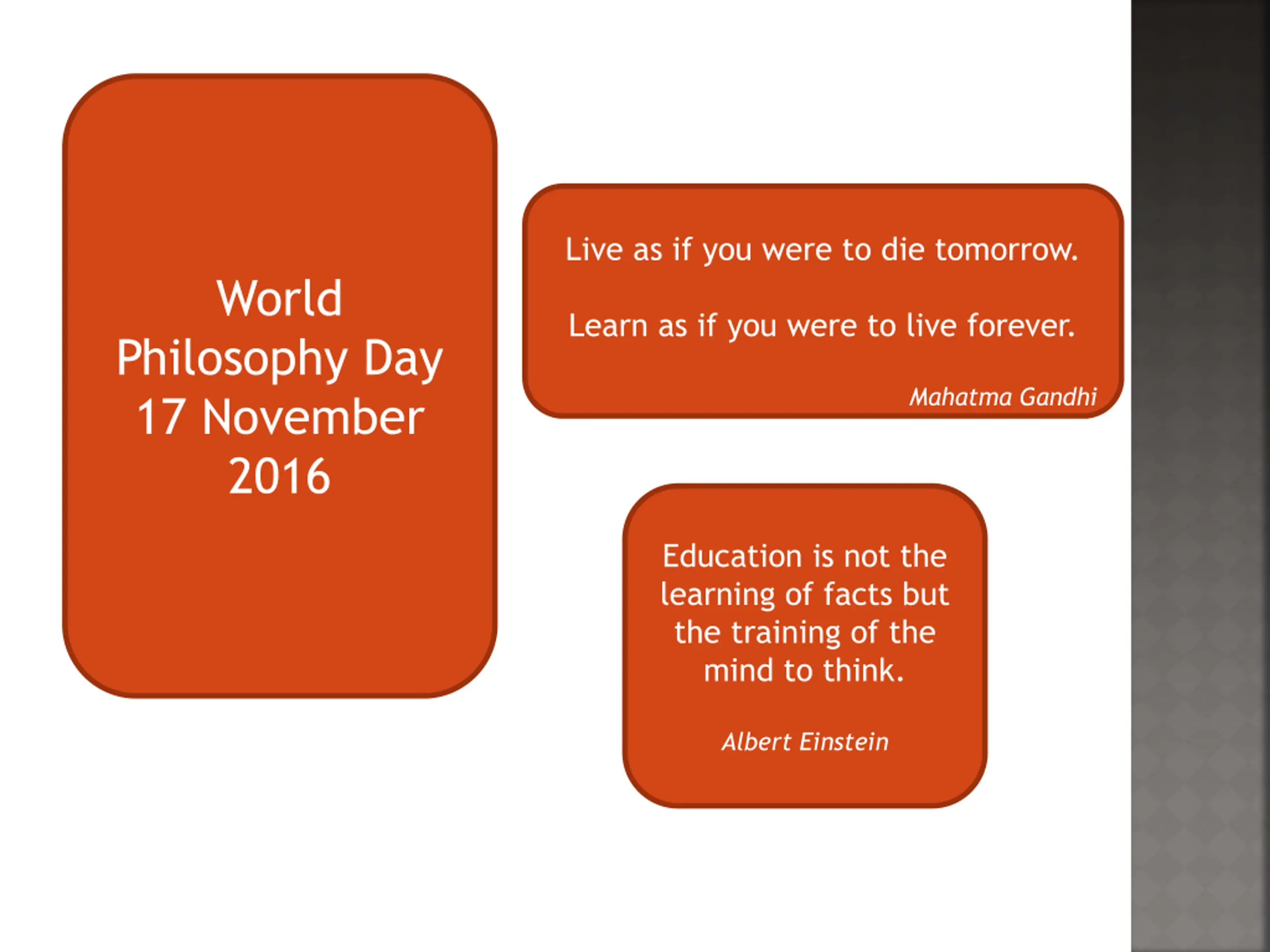 Live as if you were to die tomorrow. World Learn as if you were to live forever. Philosophy Day 17 November 2016 Mahatma Gandhi Education is not the learning of facts but the training of the mind to think. Albert Einstein