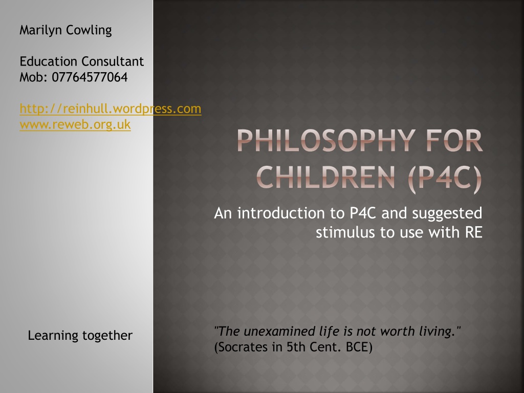 Marilyn Cowling Education Consultant Mob: 07764577064 http://reinhull.wordpress.com www.reweb.org.uk PHILOSOPHY FOR CHILDREN (P4C) An introduction to P4C and suggested stimulus to use with RE "The unexamined life is not worth living." (Socrates in 5th Cent. BCE) Learning together