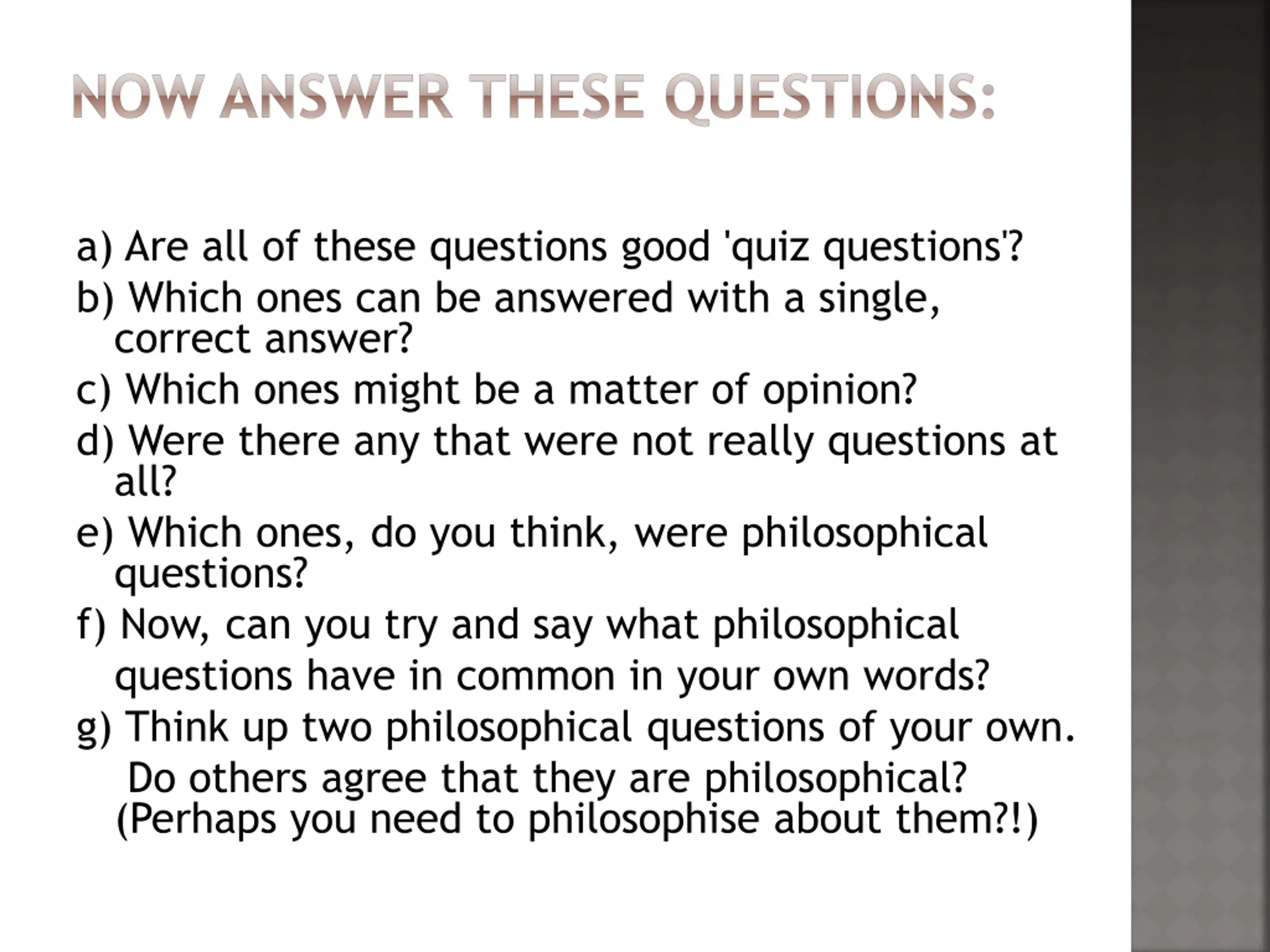 NOW ANSWER THESE QUESTIONS: a) Are all of these questions good 'quiz questions'? b) Which ones can be answered with a single, correct answer? c) Which ones might be a matter of opinion? d) Were there any that were not really questions at all? e) Which ones, do you think, were philosophical questions? f) Now, can you try and say what philosophical questions have in common in your own words? g) Think up two philosophical questions of your own. Do others agree that they are philosophical? (Perhaps you need to philosophise about them?!)
