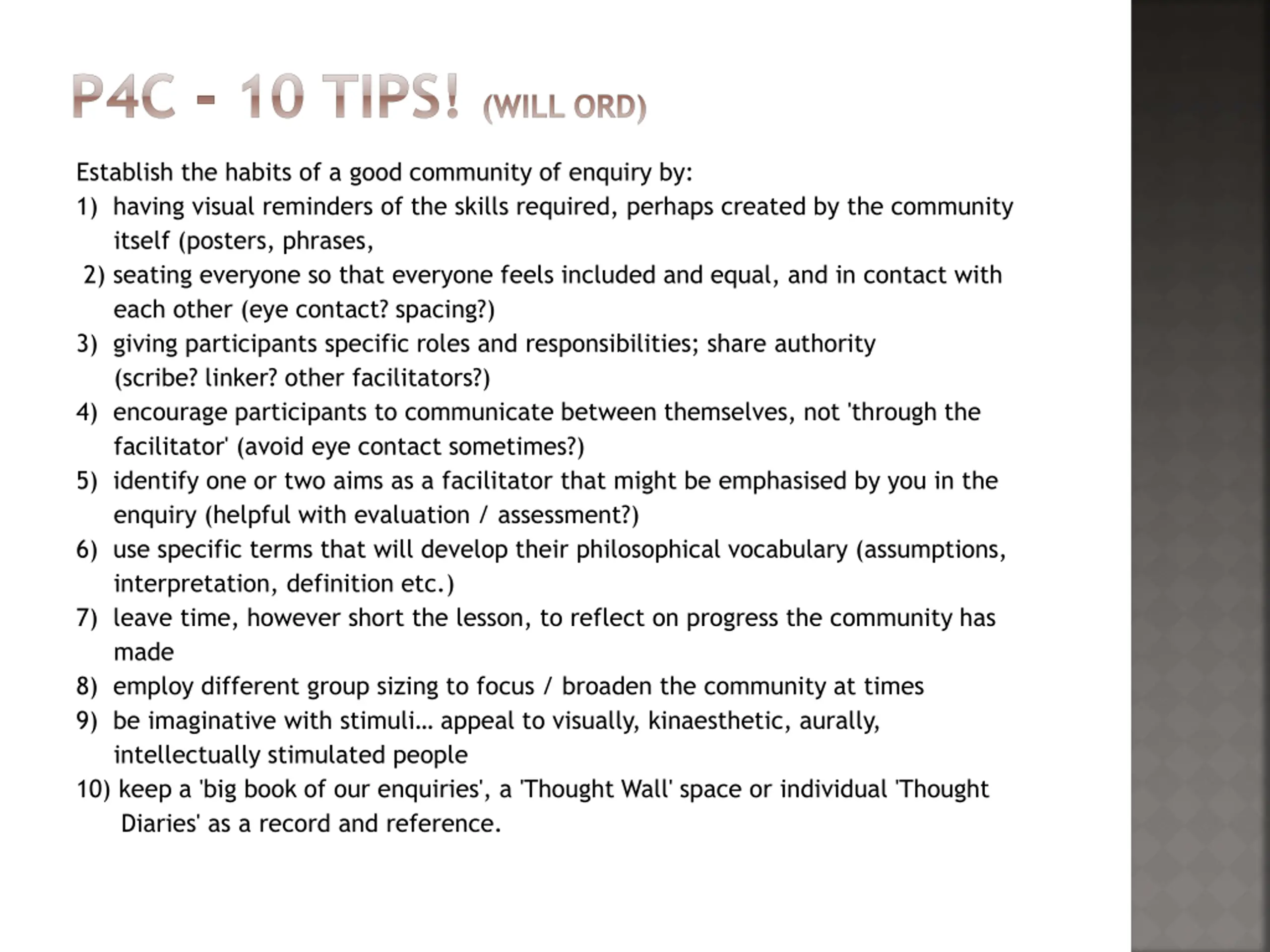 P4C - 10 TIPS! (WILL ORD) Establish the habits of a good community of enquiry by: 1) having visual reminders of the skills required, perhaps created by the community itself (posters, phrases, 2) seating everyone so that everyone feels included and equal, and in contact with each other (eye contact? spacing?) 3) giving participants specific roles and responsibilities; share authority (scribe? linker? other facilitators?) 4) encourage participants to communicate between themselves, not 'through the facilitator' (avoid eye contact sometimes?) 5) identify one or two aims as a facilitator that might be emphasised by you in the enquiry (helpful with evaluation / assessment?) 6) use specific terms that will develop their philosophical vocabulary (assumptions, interpretation, definition etc.) 7) leave time, however short the lesson, to reflect on progress the community has made 8) employ different group sizing to focus / broaden the community at times 9) be imaginative with stimuli appeal to visually, kinaesthetic, aurally, intellectually stimulated people 10) keep a 'big book of our enquiries', a 'Thought Wall' space or individual 'Thought Diaries' as a record and reference.