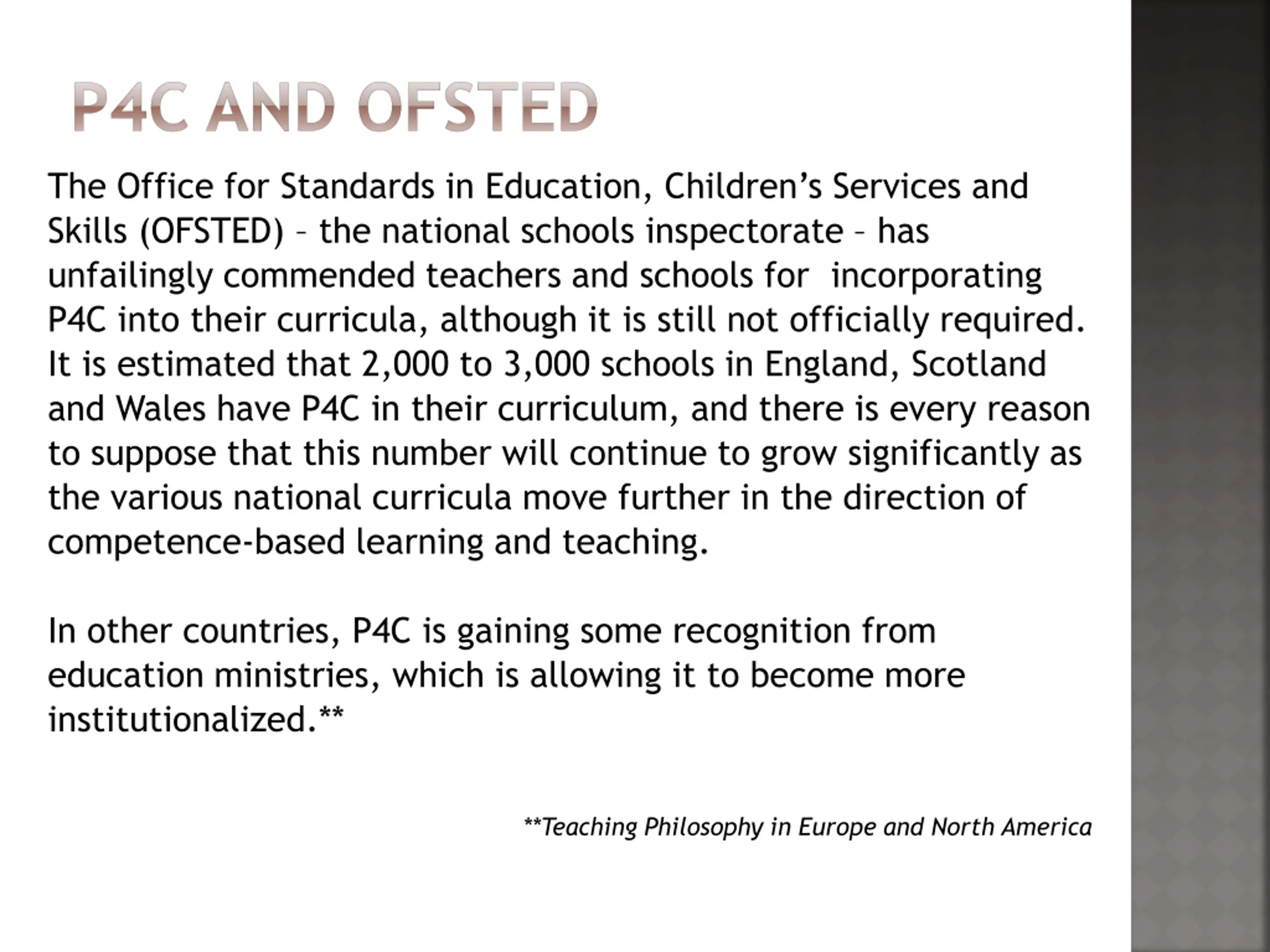 P4C AND OFSTED The Office for Standards in Education, Children s Services and Skills (OFSTED) the national schools inspectorate has unfailingly commended teachers and schools for incorporating P4C into their curricula, although it is still not officially required. It is estimated that 2,000 to 3,000 schools in England, Scotland and Wales have P4C in their curriculum, and there is every reason to suppose that this number will continue to grow significantly as the various national curricula move further in the direction of competence-based learning and teaching. In other countries, P4C is gaining some recognition from education ministries, which is allowing it to become more institutionalized.** **Teaching Philosophy in Europe and North America