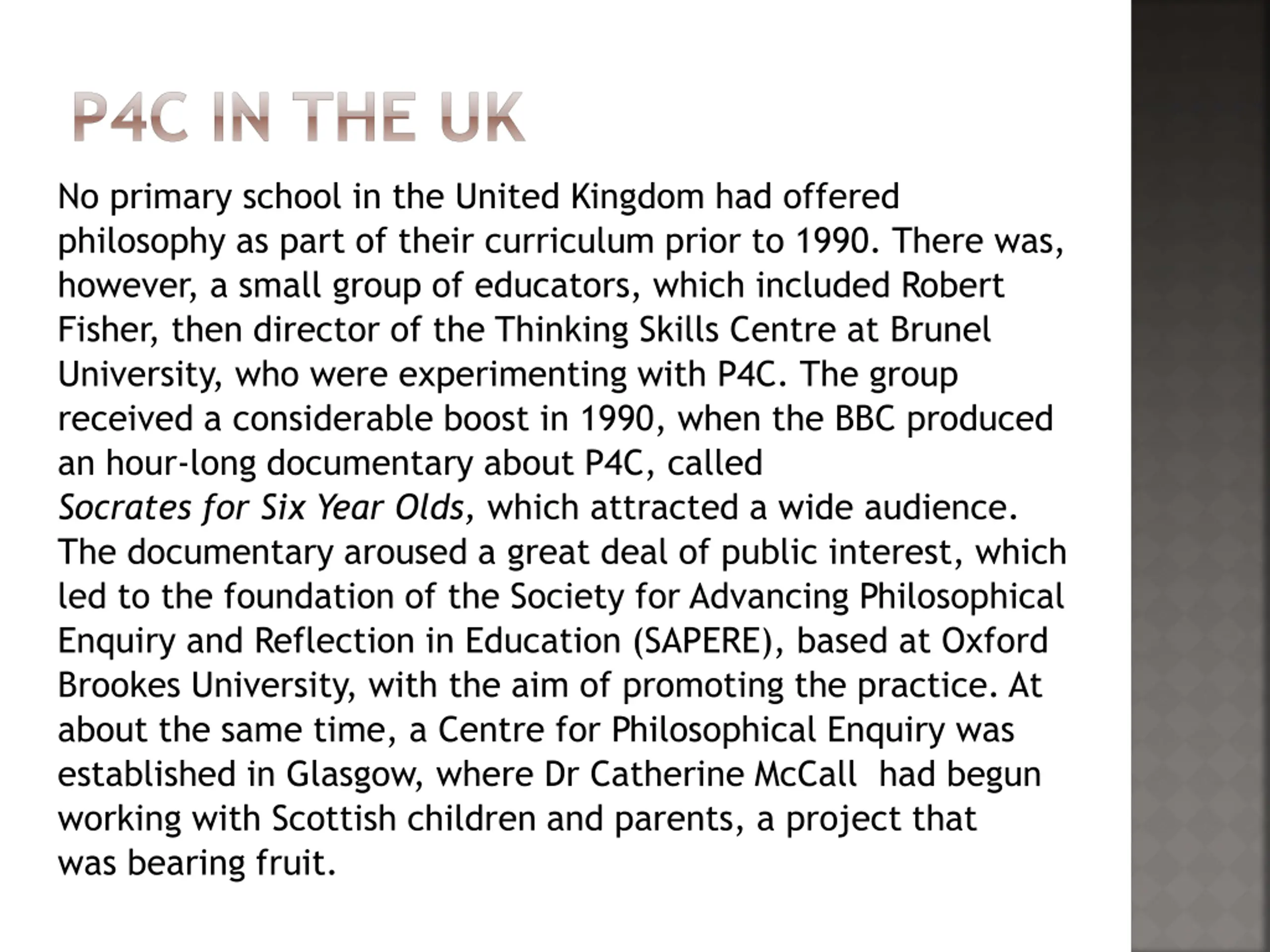 P4C IN THE UK No primary school in the United Kingdom had offered philosophy as part of their curriculum prior to 1990. There was, however, a small group of educators, which included Robert Fisher, then director of the Thinking Skills Centre at Brunel University, who were experimenting with P4C. The group received a considerable boost in 1990, when the BBC produced an hour-long documentary about P4C, called Socrates for Six Year Olds, which attracted a wide audience. The documentary aroused a great deal of public interest, which led to the foundation of the Society for Advancing Philosophical Enquiry and Reflection in Education (SAPERE), based at Oxford Brookes University, with the aim of promoting the practice. At about the same time, a Centre for Philosophical Enquiry was established in Glasgow, where Dr Catherine McCall had begun working with Scottish children and parents, a project that was bearing fruit.