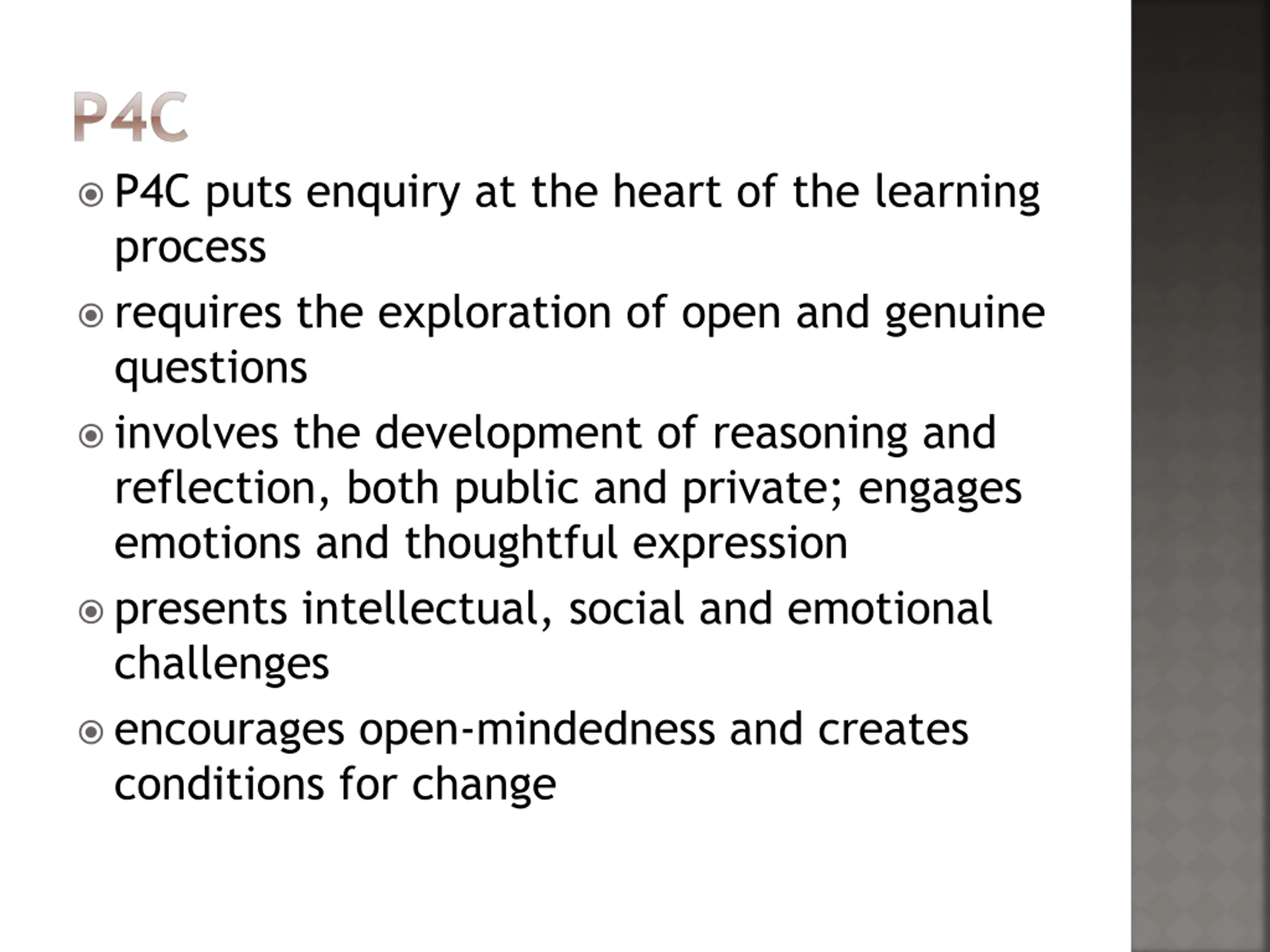P4C P4C puts enquiry at the heart of the learning process requires the exploration of open and genuine questions involves the development of reasoning and reflection, both public and private; engages emotions and thoughtful expression presents intellectual, social and emotional challenges encourages open-mindedness and creates conditions for change