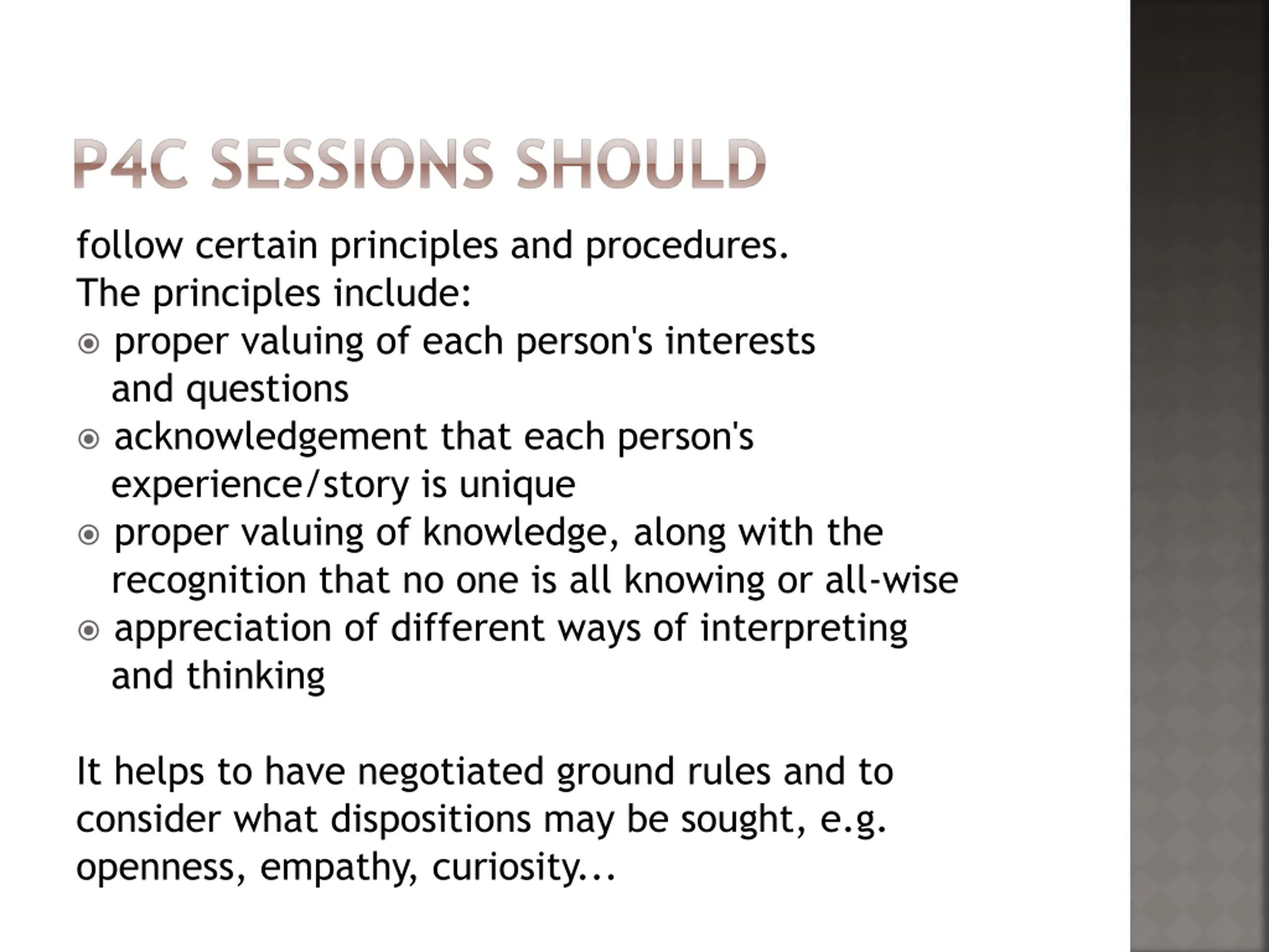 P4C SESSIONS SHOULD follow certain principles and procedures. The principles include: proper valuing of each person's interests and questions acknowledgement that each person's experience/story is unique proper valuing of knowledge, along with the recognition that no one is all knowing or all-wise appreciation of different ways of interpreting and thinking It helps to have negotiated ground rules and to consider what dispositions may be sought, e.g. openness, empathy, curiosity...