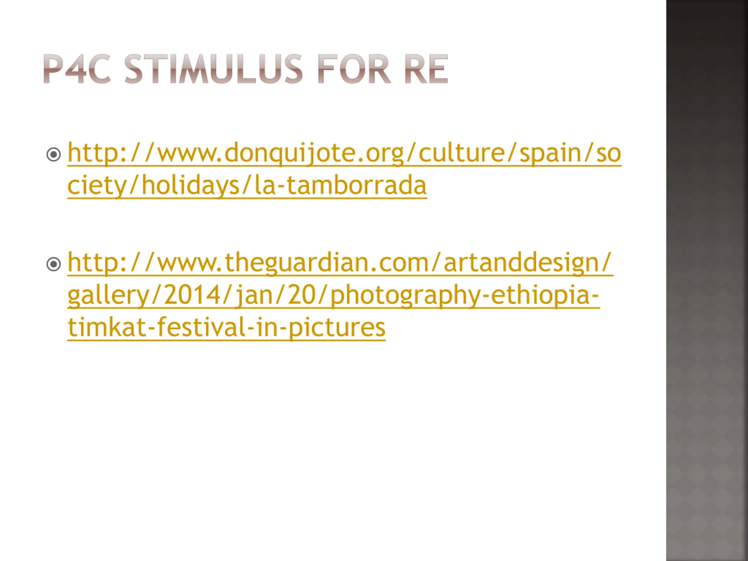 P4C STIMULUS FOR RE http://www.donquijote.org/culture/spain/so ciety/holidays/la-tamborrada http://www.theguardian.com/artanddesign/ gallery/2014/jan/20/photography-ethiopia- timkat-festival-in-pictures