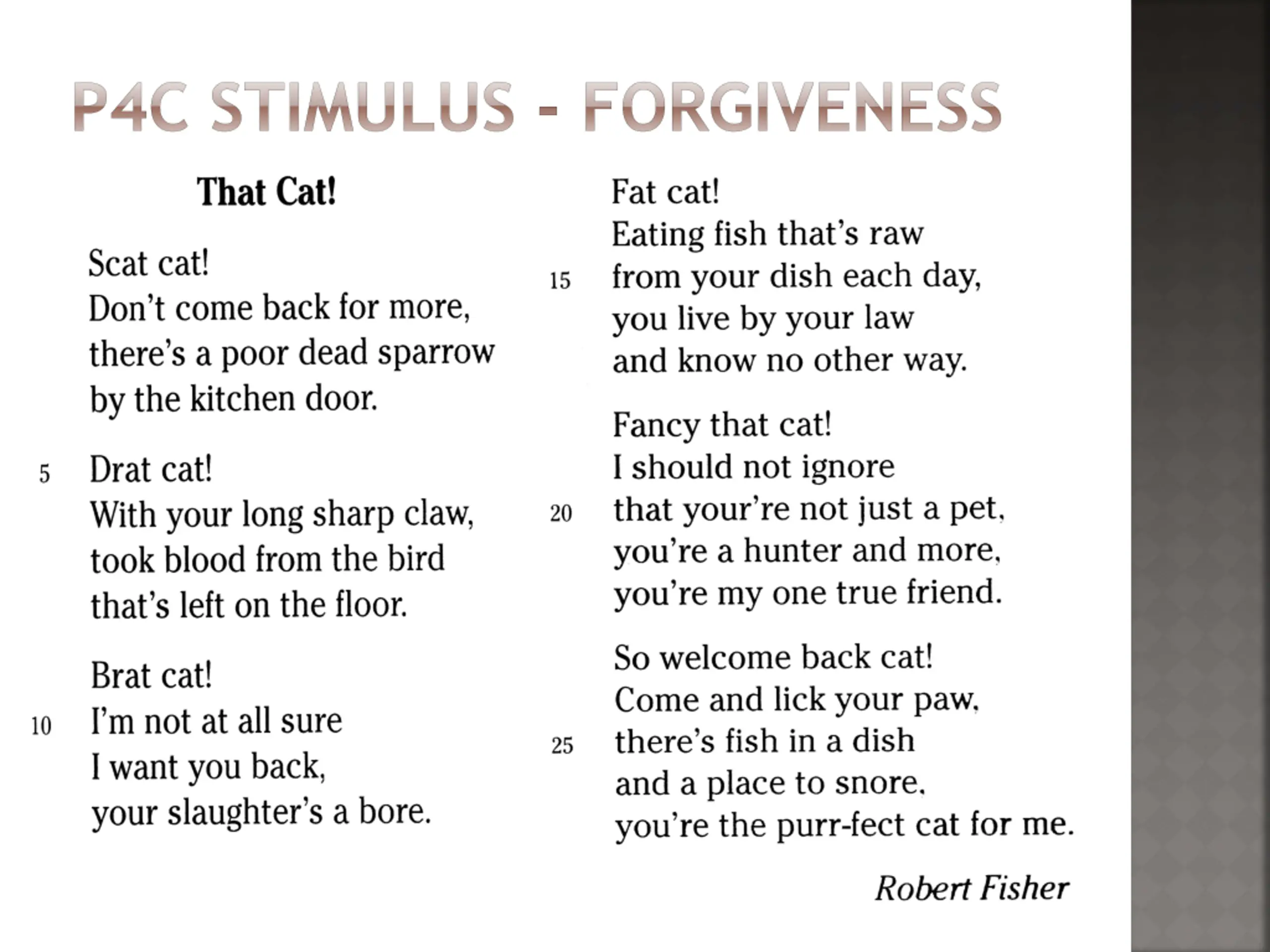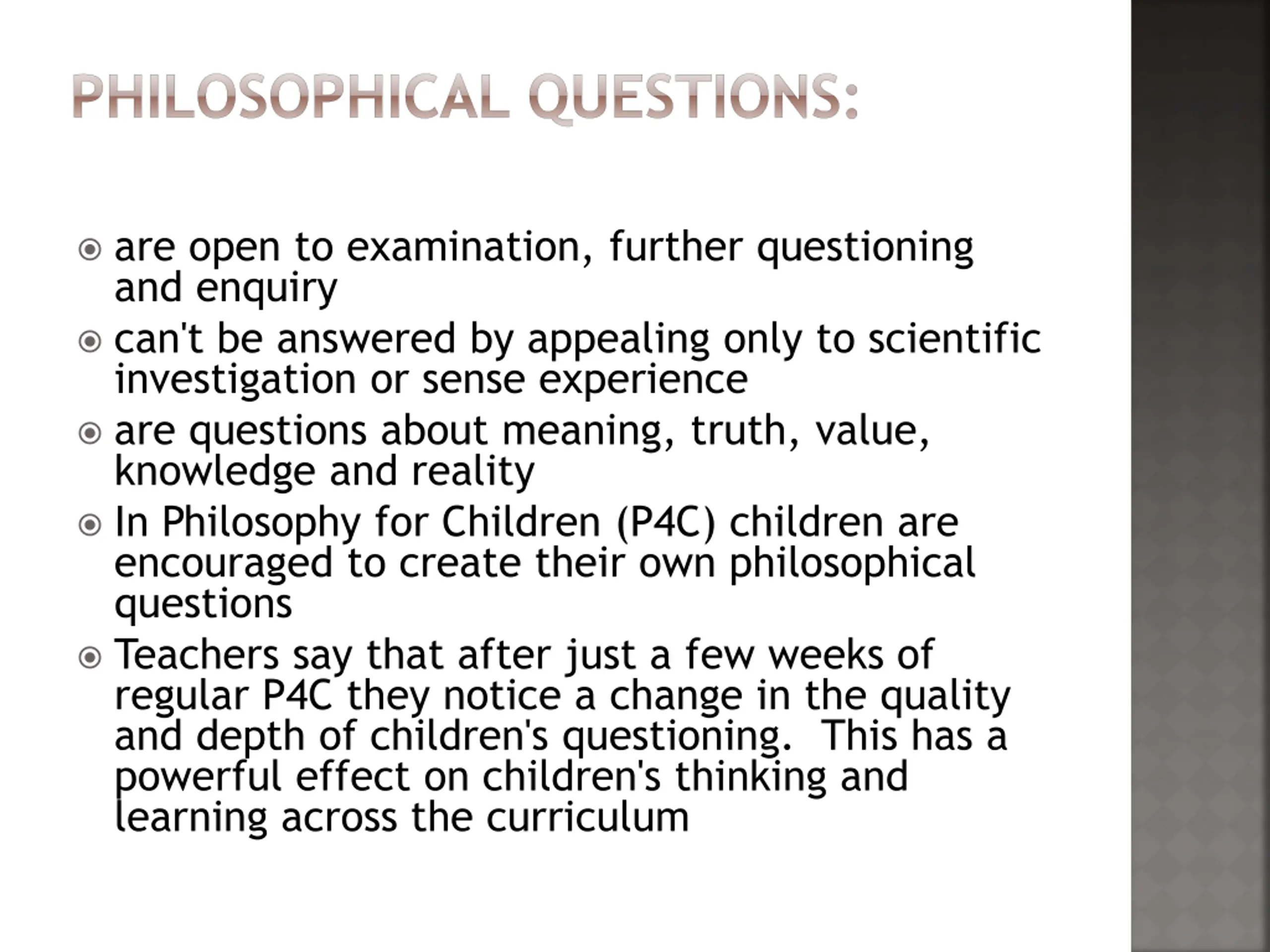PHILOSOPHICAL QUESTIONS: are open to examination, further questioning and enquiry can't be answered by appealing only to scientific investigation or sense experience are questions about meaning, truth, value, knowledge and reality In Philosophy for Children (P4C) children are encouraged to create their own philosophical questions Teachers say that after just a few weeks of regular P4C they notice a change in the quality and depth of children's questioning. This has a powerful effect on children's thinking and learning across the curriculum