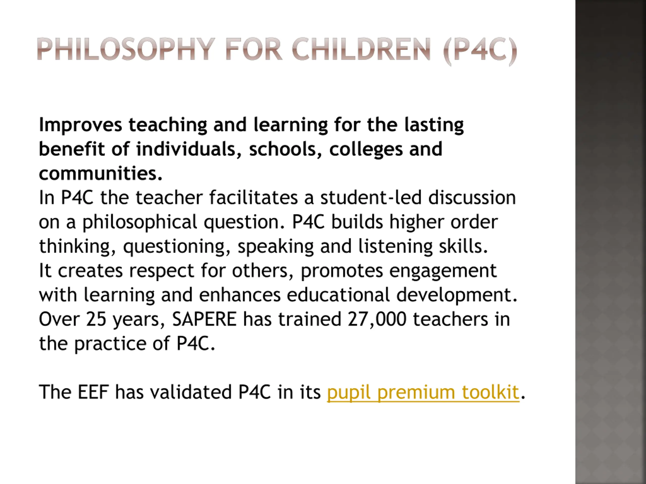 PHILOSOPHY FOR CHILDREN (P4C) Improves teaching and learning for the lasting benefit of individuals, schools, colleges and communities. In P4C the teacher facilitates a student-led discussion on a philosophical question. P4C builds higher order thinking, questioning, speaking and listening skills. It creates respect for others, promotes engagement with learning and enhances educational development. Over 25 years, SAPERE has trained 27,000 teachers in the practice of P4C. The EEF has validated P4C in its pupil premium toolkit.