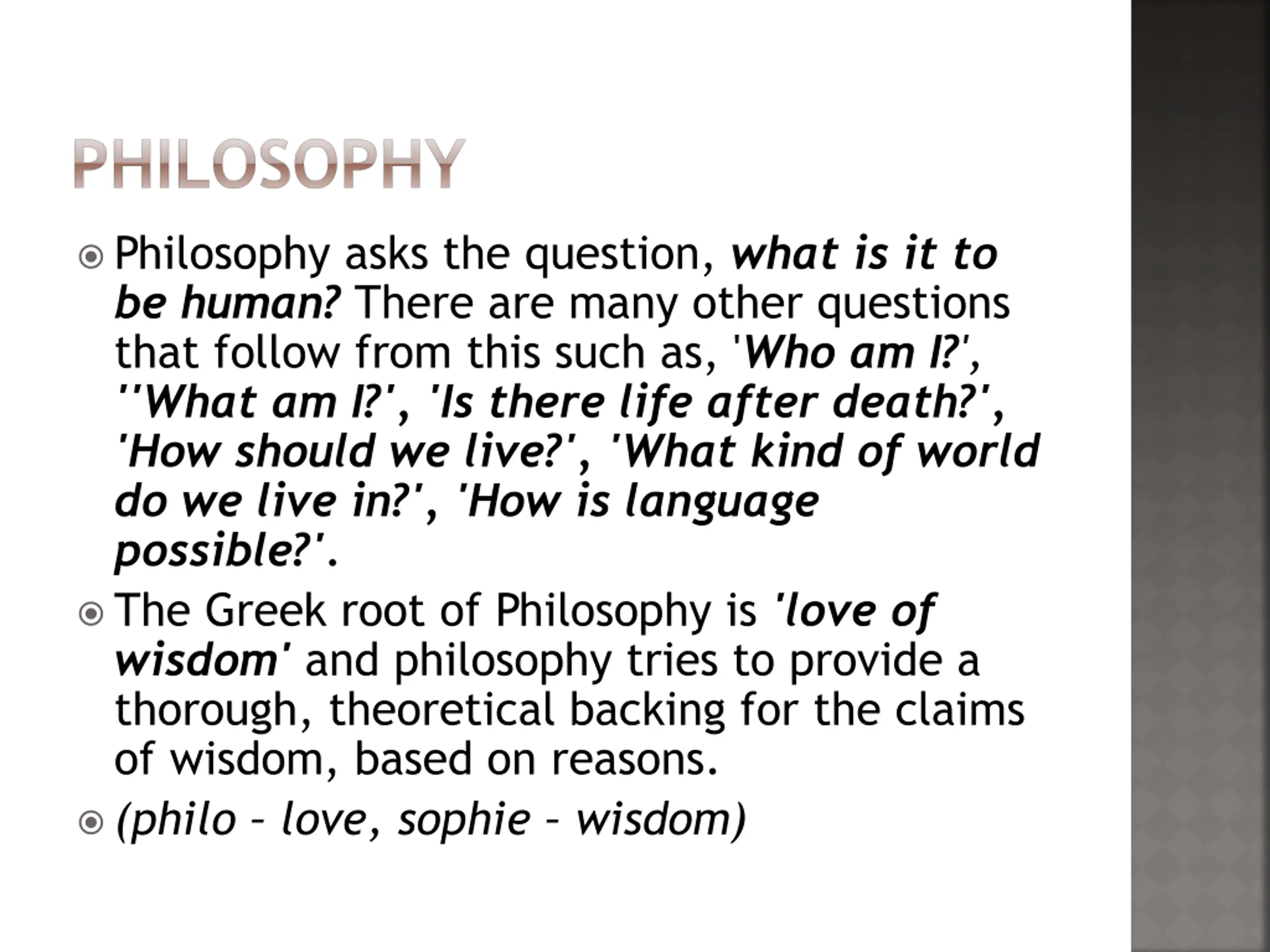 PHILOSOPHY Philosophy asks the question, what is it to be human? There are many other questions that follow from this such as, 'Who am I?', ''What am I?', 'Is there life after death?', 'How should we live?', 'What kind of world do we live in?', 'How is language possible?'. The Greek root of Philosophy is 'love of wisdom' and philosophy tries to provide a thorough, theoretical backing for the claims of wisdom, based on reasons. (philo love, sophie wisdom)