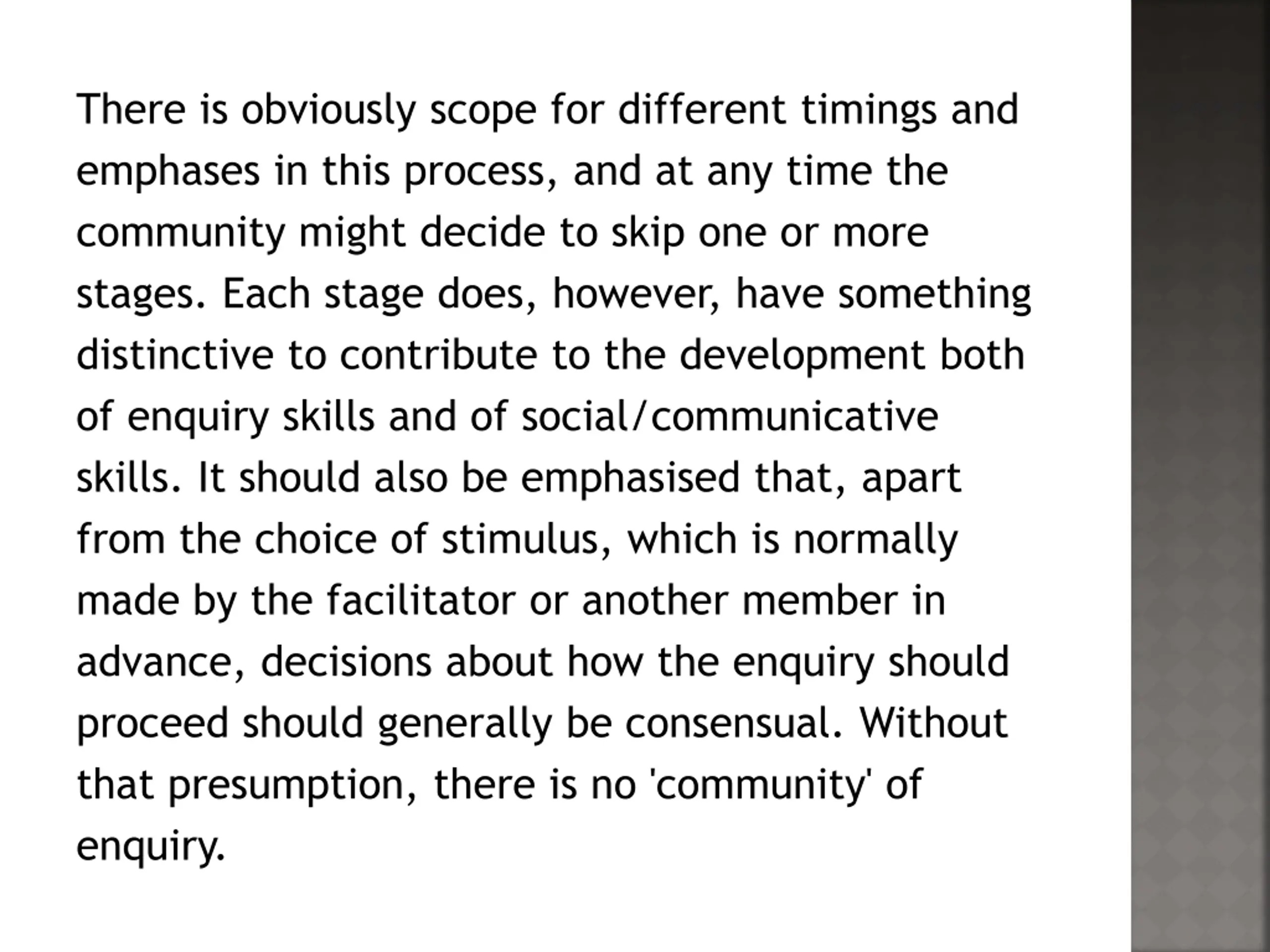 There is obviously scope for different timings and emphases in this process, and at any time the community might decide to skip one or more stages. Each stage does, however, have something distinctive to contribute to the development both of enquiry skills and of social/communicative skills. It should also be emphasised that, apart from the choice of stimulus, which is normally made by the facilitator or another member in advance, decisions about how the enquiry should proceed should generally be consensual. Without that presumption, there is no 'community' of enquiry.