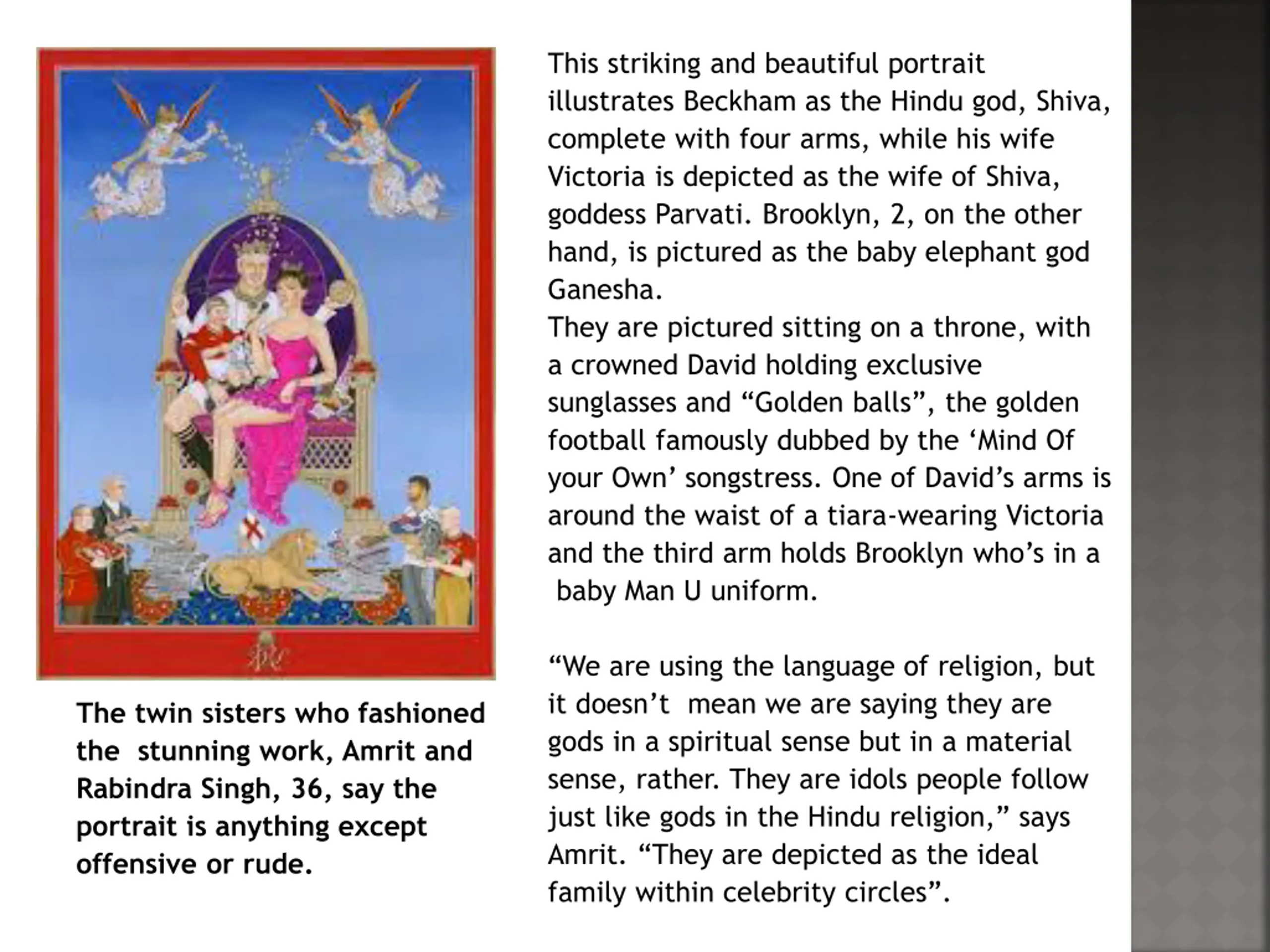 This striking and beautiful portrait illustrates Beckham as the Hindu god, Shiva, complete with four arms, while his wife Victoria is depicted as the wife of Shiva, goddess Parvati. Brooklyn, 2, on the other hand, is pictured as the baby elephant god Ganesha. They are pictured sitting on a throne, with a crowned David holding exclusive sunglasses and Golden balls , the golden football famously dubbed by the Mind Of your Own songstress. One of David s arms is around the waist of a tiara-wearing Victoria and the third arm holds Brooklyn who s in a baby Man U uniform. We are using the language of religion, but it doesn t mean we are saying they are gods in a spiritual sense but in a material sense, rather. They are idols people follow just like gods in the Hindu religion, says Amrit. They are depicted as the ideal family within celebrity circles . The twin sisters who fashioned the stunning work, Amrit and Rabindra Singh, 36, say the portrait is anything except offensive or rude.