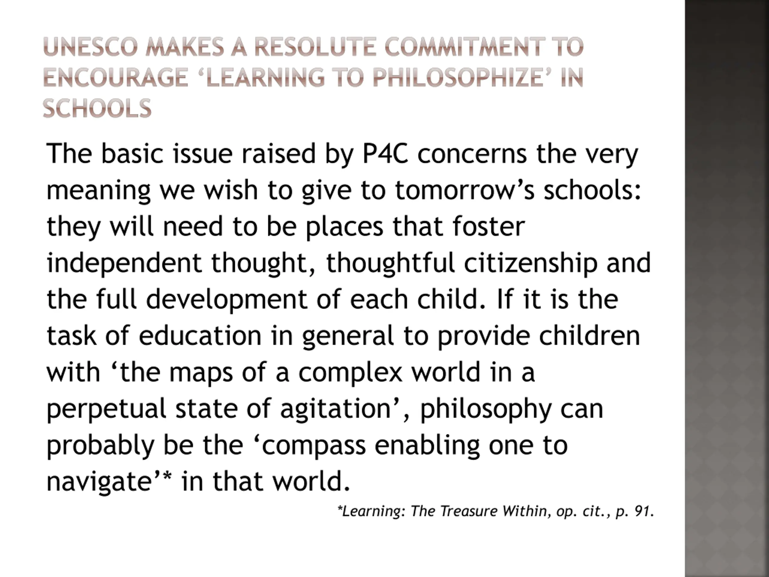 UNESCO MAKES A RESOLUTE COMMITMENT TO ENCOURAGE LEARNING TO PHILOSOPHIZE IN SCHOOLS The basic issue raised by P4C concerns the very meaning we wish to give to tomorrow s schools: they will need to be places that foster independent thought, thoughtful citizenship and the full development of each child. If it is the task of education in general to provide children with the maps of a complex world in a perpetual state of agitation , philosophy can probably be the compass enabling one to navigate * in that world. *Learning: The Treasure Within, op. cit., p. 91.