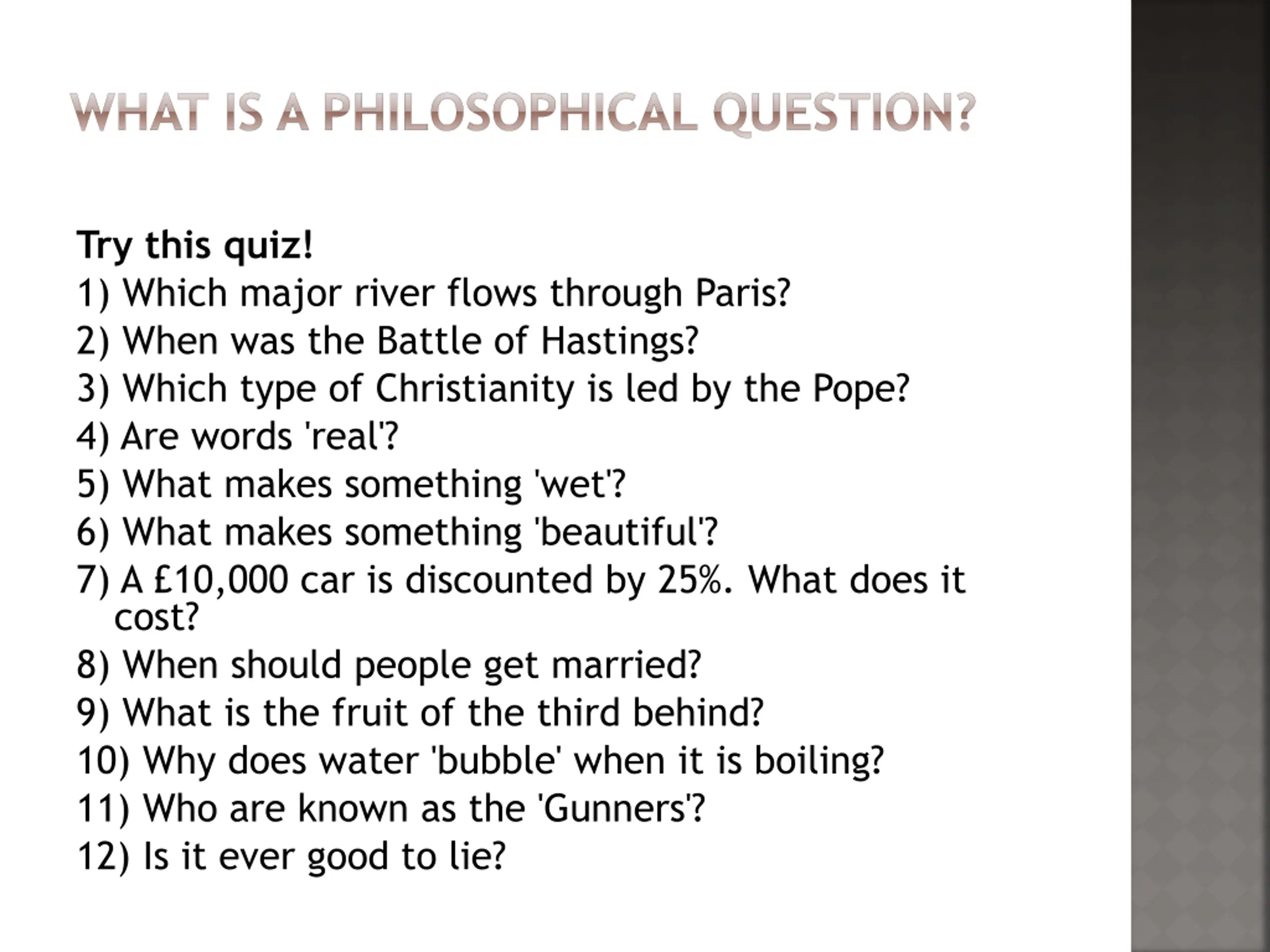 WHAT IS A PHILOSOPHICAL QUESTION? Try this quiz! 1) Which major river flows through Paris? 2) When was the Battle of Hastings? 3) Which type of Christianity is led by the Pope? 4) Are words 'real'? 5) What makes something 'wet'? 6) What makes something 'beautiful'? 7) A 10,000 car is discounted by 25%. What does it cost? 8) When should people get married? 9) What is the fruit of the third behind? 10) Why does water 'bubble' when it is boiling? 11) Who are known as the 'Gunners'? 12) Is it ever good to lie?